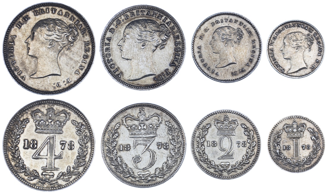 (x) Victoria (1837-1901), 'Young Head' Maundy Set, 1878, young head left, rev. crowned mark of value, edges plain (Bull 3531; ESC 2491; Spink 3916), cleaned and some hairlines, yet glossy in the fields, extremely fine (4)