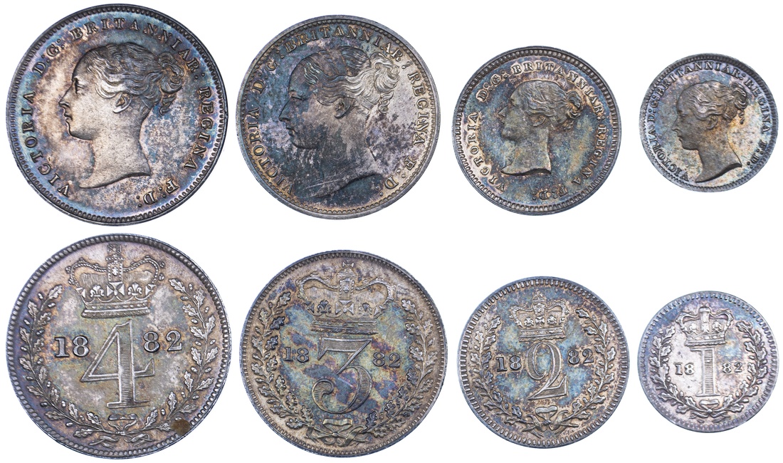 (x) Victoria (1837-1901), 'Young Head' Maundy Set, 1882, young head left, rev. crowned mark of value, edge plain (Bull 3538; ESC 2496; Spink 3916), some scuffs across the Threepence truncation, otherwise with dark toning and mostly brilliant beneath, uncirculated, in case (4)