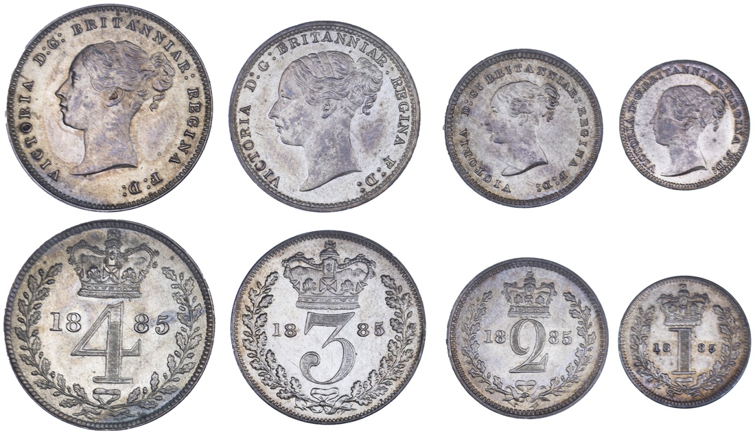 (x) Victoria (1837-1901), 'Young Head' Maundy Set, 1885, young head left, rev. crowned mark of value, edges plain (Bull 3542; ESC 2499; Spink 3916), glossy cartwheel lustre, uncirculated (4)