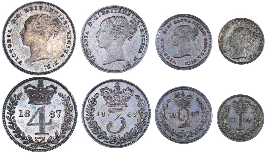 (x) Victoria (1837-1901), 'Young Head' Maundy Set, 1887, young head left, rev. crowned mark of value, edges plain (Bull 3544; ESC 2501; Spink 3916), couple of hairlines to the Threepence, otherwise with a handsome and dark glossy brilliance to dark surfaces, uncirculated, in case (4)