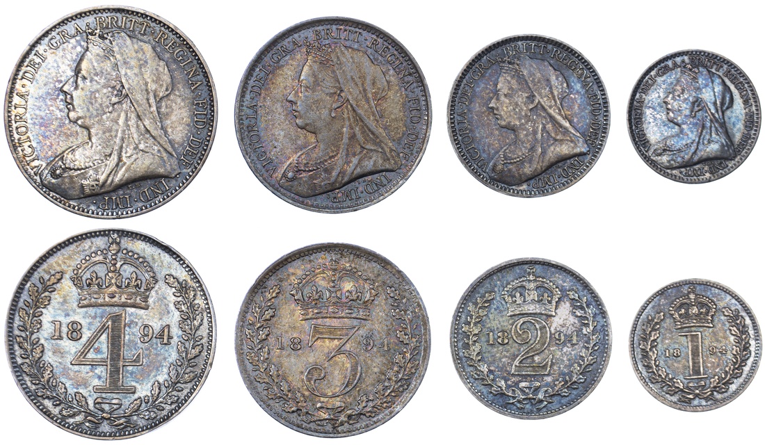 (x) Victoria (1837-1901), 'Old Head' Maundy Set, 1894, veiled head left, rev. crowned mark of value, edges plain (Bull 3552; ESC 2509; Spink 3943), small bruise to the reverse edge of the Fourpence, brilliance beneath toned surfaces, nearing as struck, in original case of issue (4)