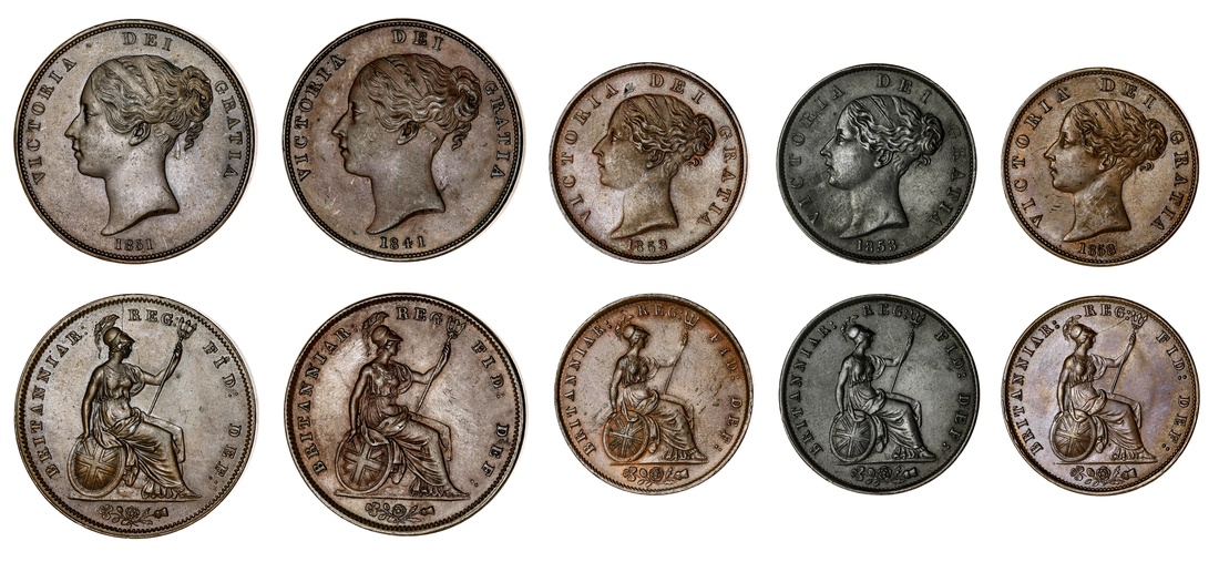 Victoria (1837-1901), Penny, 1841 OT, no colon, young filleted head left, W.W. incuse on truncation, rev. Britannia seated right, with ornamental trident, no colon after REG, plain edge, 18.85g, 12h (BMC [Peck 1484; Bull 3948), some very light bagmarks, with reddish-brown surfaces, nearing extremely fine; and Penny, 1851 OT, DEF close colon, young filleted head left, W.W. incuse on truncation, rev. Britannia seated right, with ornamental trident, plain edge, 19.08g, 12h (BMC [Peck 1499; Bull 3948), small metal flaw above I in FID and a couple of small contact marks, nevertheless with a pleasing lustre and tone overlaying brown surfaces, handsome extremely fine; and Halfpenny, 1853, bare head left, rev. Britannia seated right, dots on shield, plain edge, 9.35g, 12h (Spink 3949), dark tone, very fine; and Halfpenny, 1853 over 1, bare head left, rev. Britannia seated right, plain edge, 9.44g, 12h (Spink 3949), handsome light brown and reddish surfaces, some lustre, good very fine; and Halfpenny, 1858 over 6, bare head left, rev. Britannia seated right, plain edge, plain edge, 9.53g, 12h (Spink 3949), R in GRATIA repunched, flashes of red to light brown and residually lustrous surfaces, handsome extremely fine (5)