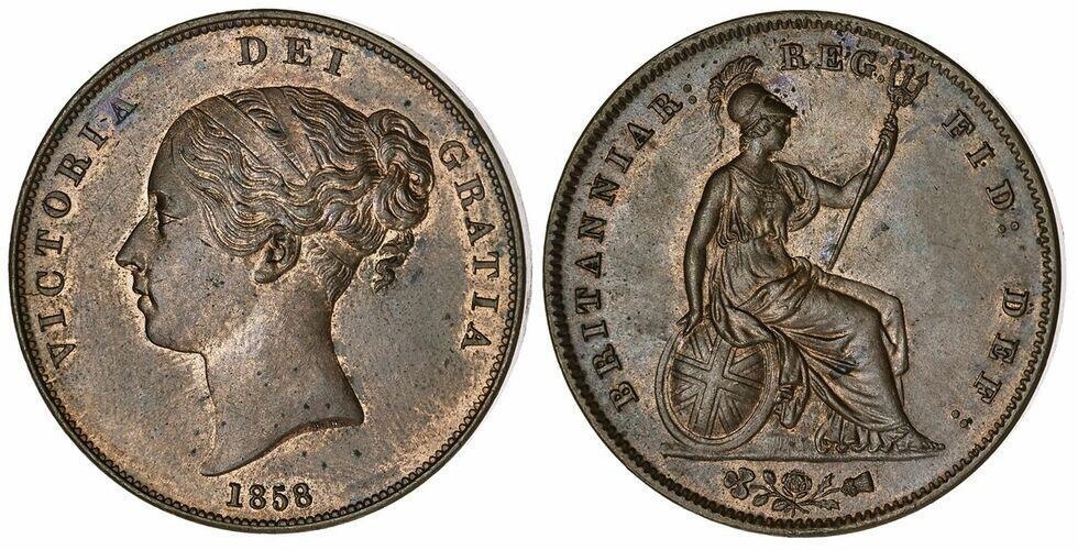 Victoria (1837-1901), Penny, 1858 over 6 OT, young filleted head left,