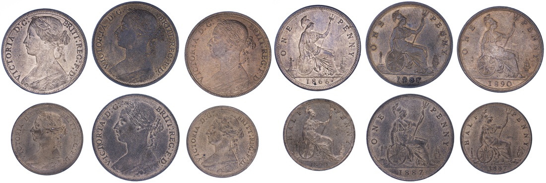 (x) Victoria (1837-1901), Penny, 1866 [Dies 6+G], young head left, rev. Britannia seated right, plain edge, 12h, 9.34g (BMC [Peck] 1670; Spink 3954), small contact mark to the cheek, hairline die flaw running through reverse field, yet with near full mint red surfaces, about uncirculated; Penny, 1887 [Dies 12+N], young head left, rev. Britannia seated right, plain edge, 12h, 9.38g (BMC [Peck] 1739; Spink 3954), with pleasing red surfaces beneath lightly darkened surfaces, extremely fine; another, plain edge, 12h, 9.51g (BMC [Peck] 1739; Spink 3954), touch of rub to the very highest points, yet with a pleasing red beneath lightly darkened surfaces, extremely fine; Penny, 1890 [Dies 12+N], young head left, rev. Britannia seated right, plain edge, 12h, 9.50g (BMC [Peck] 1742; Spink 3954), some minor scuffing to otherwise fully mint red surfaces, lustrous, just uncirculated; Halfpenny, 1887, young head left, rev. Britannia seated right, plain edge, 12h, 5.77g (BMC [Peck] 1843; Spink 3956), with pleasing red surfaces, nearing uncirculated; Halfpenny, 1890, young head left, rev. Britannia seated right, plain edge, 12h, 5.50g (BMC [Peck] 1846; Spink 3956), some minor scuffing to the highest points, yet with pleasing red surfaces and lustrous, uncirculated (6)