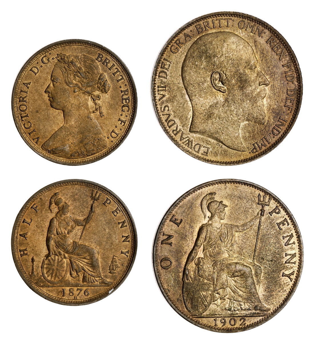Victoria (1837-1901), Halfpenny, 1876 H, young laureate head left, rev. Britannia seated right, plain edge, 12h, 5.47g (Spink 3957; BMC [Peck] 1814), a couple of light contact marks across the chin, nonetheless with near full mint red surfaces, about uncirculated; Edward VII (1901-1910), Penny, 1902, bare head right, rev. Britannia seated right, plain edge, 12h, 9.44g (Spink 3990), with near full mint red surfaces, about uncirculated (2)