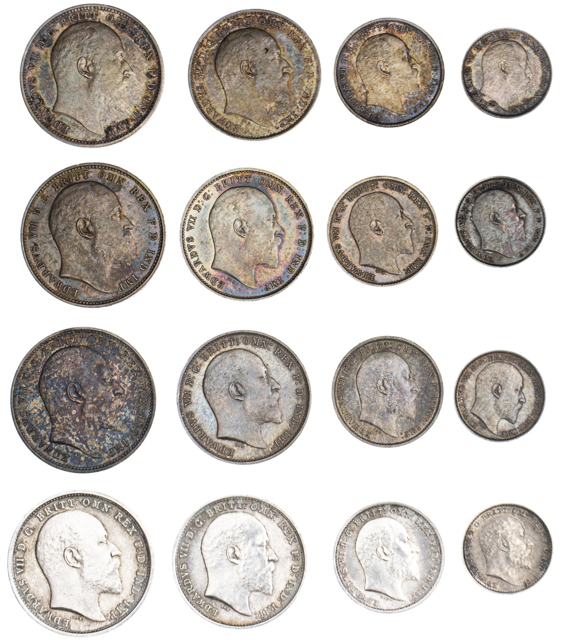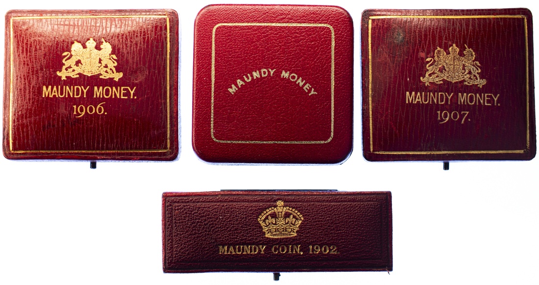 (x) Edward VII (1901-1910), Maundy Sets (4), 1902, bare head right, rev. crowned mark of value, edges plain (Bull 3609; ESC 2519; Spink 3985), glossy lustre to the fields, extremely fine, in case of issue; 1906, bare head right, rev. crowned mark of value, edges plain (Bull 3612; ESC 2522; Spink 3985), handsome cabinet tone to brilliant fields, as struck, in original case of issue; 1907, bare head right, rev. crowned mark of value, edges plain (Bull 3613; ESC 2523; Spink 3985), darker cabinet tone to brilliant fields, as stuck, in original case of issue; 1908, bare head right, rev. crowned mark of value, edges plain (Bull 3614; ESC 2524; Spink 3985), with a lightly polished appearance, otherwise toned and brilliant, extremely fine (16)