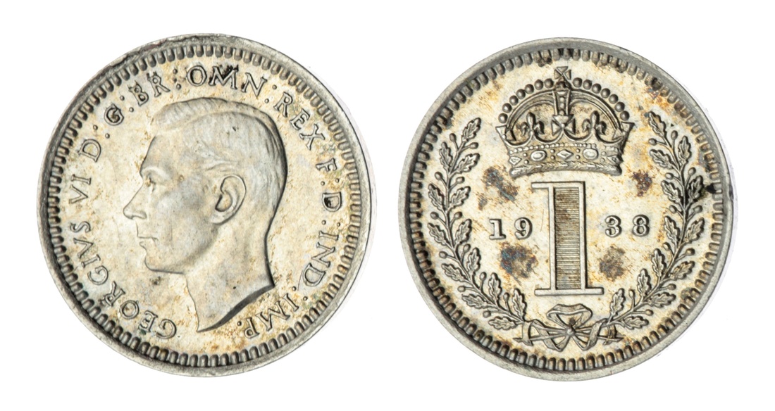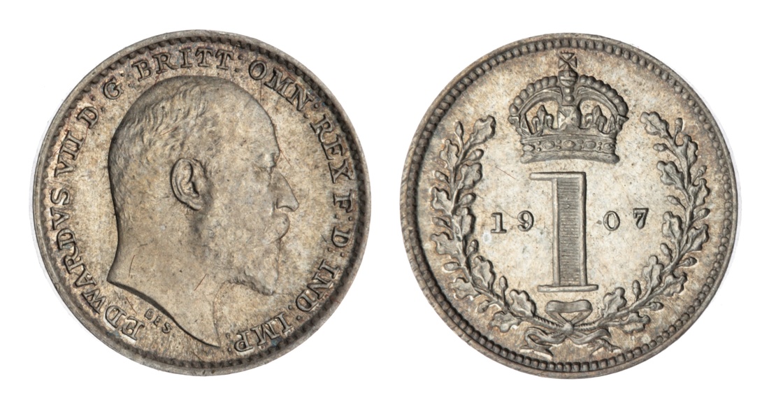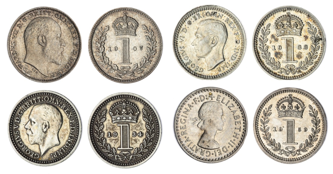20th Century Maundy Pennies (4) | Edward VII (1901-1917), Penny, 1907, plain edge, 0.47g, 12h (ESC 2523; Bull 3613; Spink 3989); George V (1910-1936), Penny, 1934, plain edge, 0.48g, 12h (ESC 2551; Bull 3995; Spink 4047); George VI (1936-1952), Penny, 1938, plain edge, 0.47g, 12h (ESC 2555; Bull 4307; Spink 4090); Elizabeth II (1952-2022), Penny, 1959, plain edge, 0.47g, 12h (ESC 2576; Bull 4569; Spink 4135), extremely fine