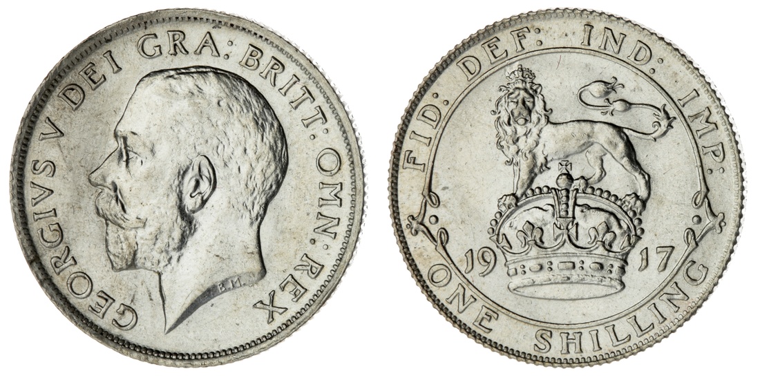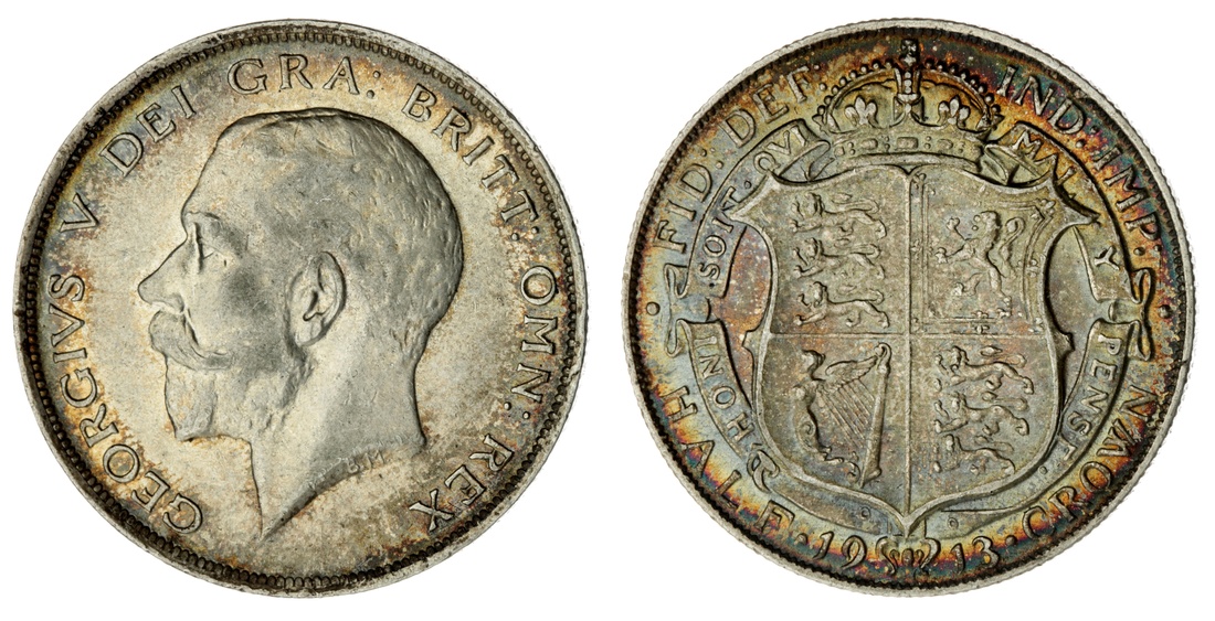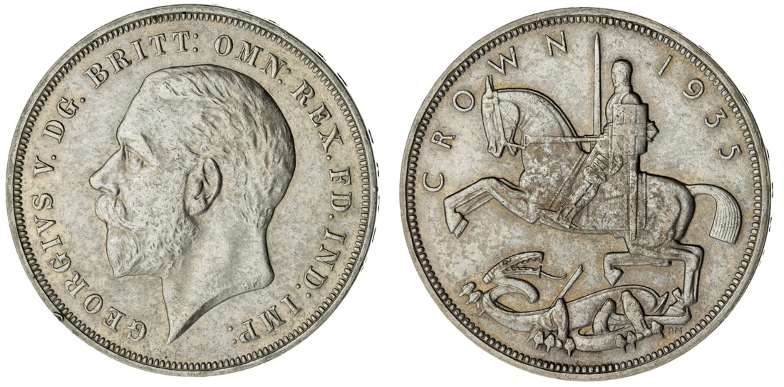 George V (1910-1936), 'Rocking Horse' Crown, 1935, bare head left, rev. St George and dragon, modernistic style, incuse lettered edge, 12h, 28.15g (ESC 375; Bull 3651; Spink 4048), a handful of contact marks, including to edge at 8 o'clock, otherwise lightly toned to somewhat frosty surfaces, very fine; Halfcrown, 1913, bare head left, rev. crowned shield in Garter, milled edge, 12h, 14.14g (ESC 760-[R]; Bull 3712; Spink 4011), some faint contact marks to obverse, otherwise richly toned in the legend and to the reverse, very fine, the key date in series; Shilling, 1917, bare head left, rev. lion passant on crown, milled edge, 12h, 5.64g (ESC 1427; Bull 3806; Spink 4013), wiped yet highly lustrous, bolder very fine; Shilling, 1928, bare head left, rev. lion passant on crown, milled edge, 1h, 5.63g (ESC 1441; Bull 3832; Spink 4039), nailmark to face, otherwise lightly toned and residually lustrous, very fine / extremely fine (4)