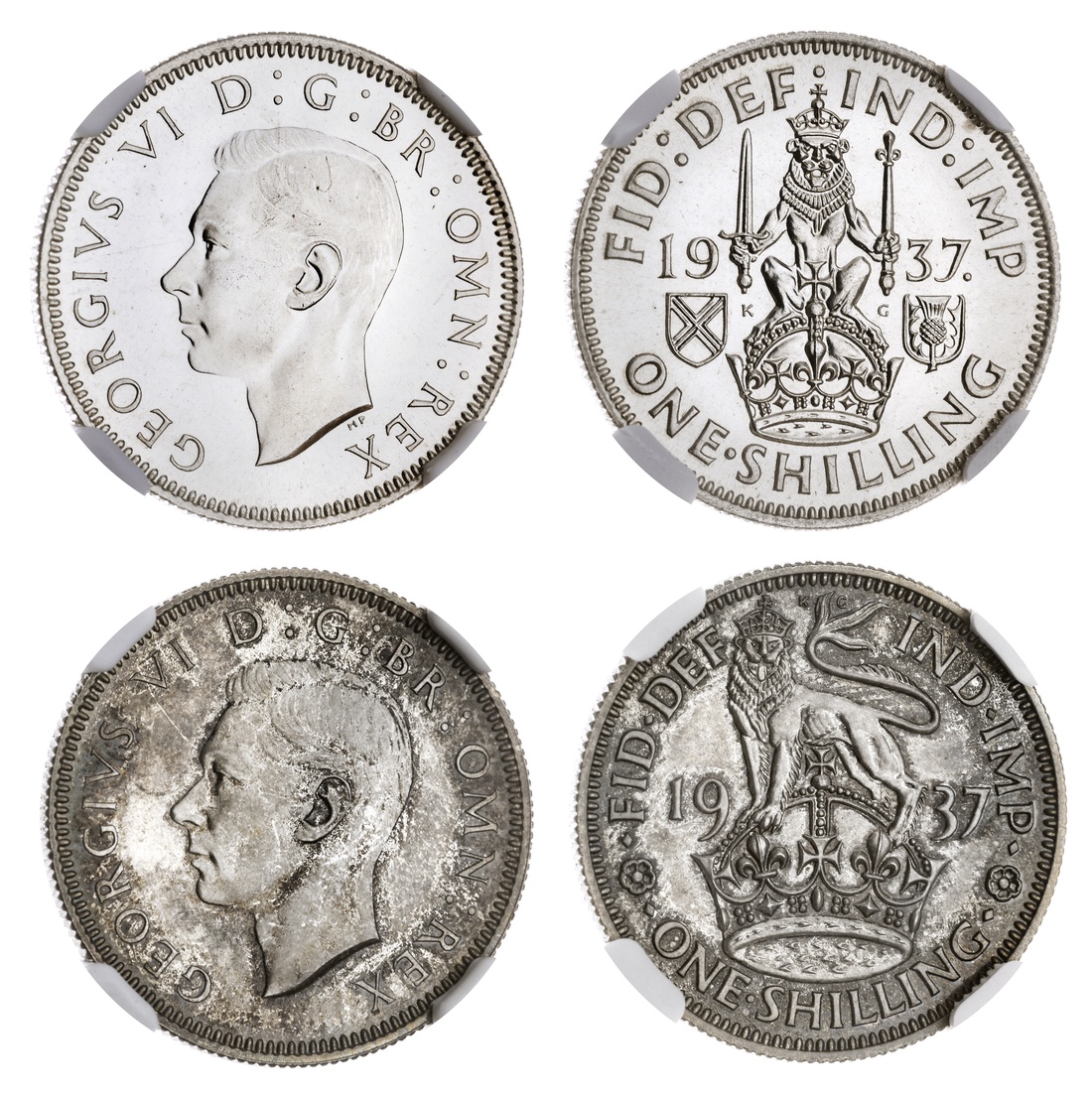 NGC PF65 | George VI (1936-1952), Proof 'English' Shilling, 1937, bare head left, rev. lion atop crown, milled edge, 12h (ESC 1451; Bull 4121; Spink 4082), the faintest of friction marks to the obverse, otherwise with a glossy brilliance to dark grey toned surfaces, uncirculated, in NGC holder, graded PF65 (Cert. #6518352-058); and NGC PF62 | Proof 'Scottish' Shilling, 1937, bare head left, rev. lion sitting upon crown, milled edge, 12h (ESC 1453; Bull 4150; Spink 4083), hairlined to brilliant fields, otherwise about uncirculated, in NGC holder, graded PF62 (Cert. #6518352-024) (2)