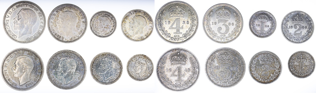 (x) George V (1910-1936), Maundy Set, 1936, bare head left, rev. crowned mark of value, edges plain (Bull 3997; ESC 2553; Spink 4043), speckled toning to brilliant fields, as struck, in original case of issue; George VI (1936-1952), Maundy Set, 1943, bare head left, rev. crowned mark of value, edges plain (ESC 2560; Bull 4312; Spink 4086), speckled toning to brilliant surfaces, as struck, in original case of issue (8)