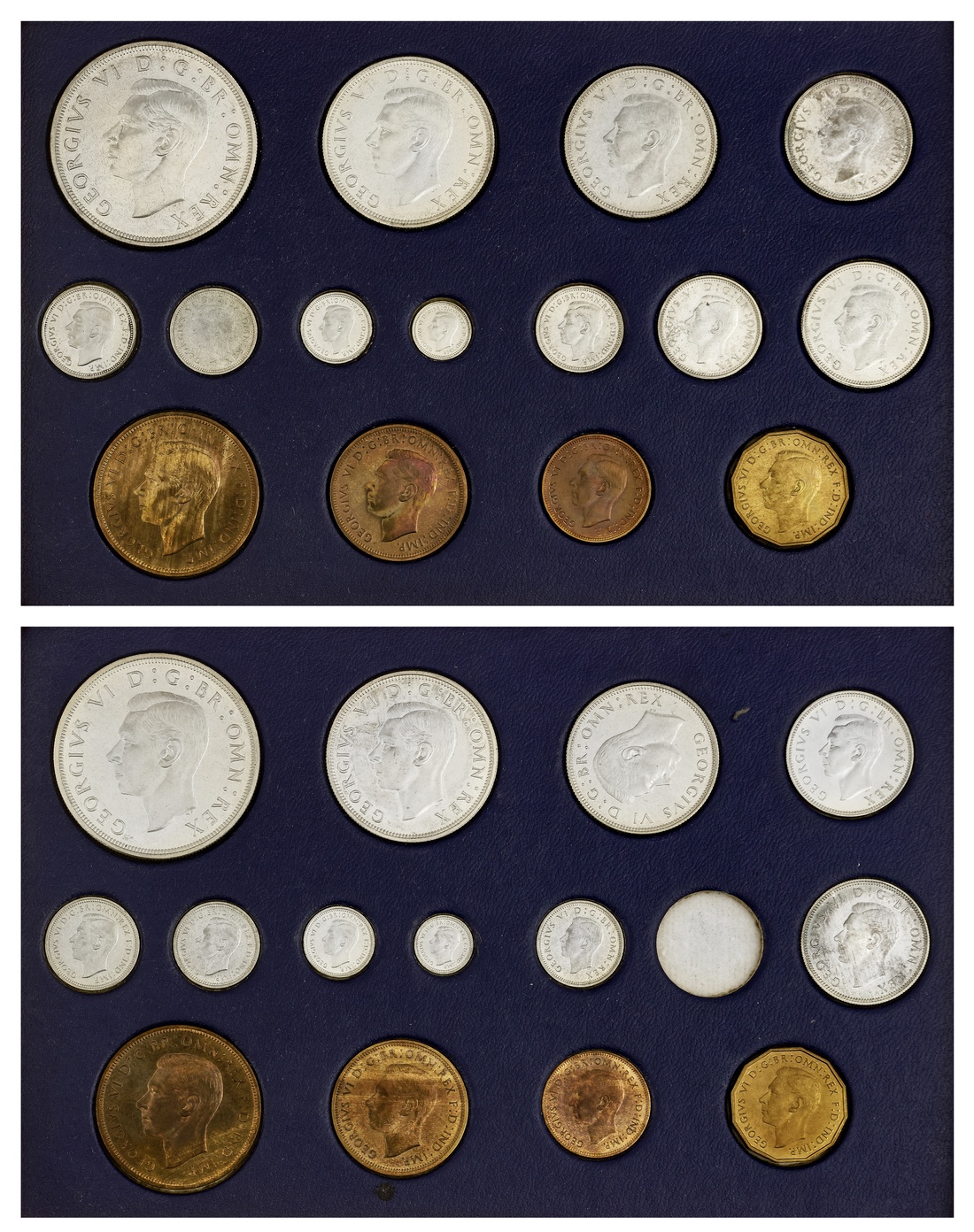 George VI (1936-1952), Coronation Specimen Set, 1937 (15), Proof Crown to Farthing, and Maundy Fourpence to Penny (Spink PS16), some haziness to the fields of the silver denominations, otherwise brilliant, the bronze toned, practically as struck, in original Royal Mint cardboard box and accompanied with original Royal Mint leather presentation box; another, Coronation Specimen Set, 1937 (14), Proof Crown to Farthing, and Maundy Fourpence to Penny, excluding Sixpence (Spink PS16), some faint evidence of previous handling, hairlining to the Halfcrown, otherwise brilliant, the bronze with a pleasing glossy brilliance, near as struck, in original Royal Mint cardboard box and accompanied with original Royal Mint leather presentation box (29)