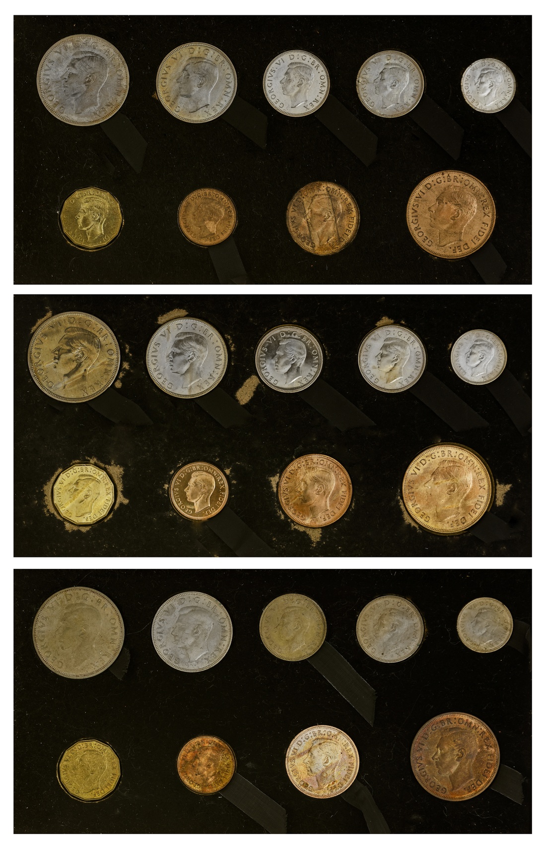George VI (1937-1952), 'Mid-Century' Specimen Proof Sets, 1950 (2), Proof Halfcrown to Farthing (9) (Spink PS17), the first set with some whisps of hairlines, most evident to the Penny, otherwise brilliant and much as struck, the second set much the same and with some verdigris to the edge of the Halfcrown, brilliant, much as struck; 'Mid-Century' Composite Specimen Set, 1950, Halfcrown to Farthing (9) (cf. Spink PS17), both Shillings and the Threepence likely currency strikings, some verdigris to the edge of the Halfcrown, otherwise all extremely fine to practically as struck, all sets in original Royal Mint box of issue (3 sets in total)