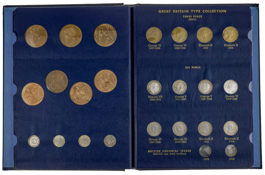 Whitman Folder of 20th Century Minor Coins (37) | including, Farthings (7), 1902, 1921, 1932, 1945, 1952, 1953, 1955, 2.89g, 12h; 2.81g, 12h; 2.87g, 12h; 2.92g, 12h; 2.87g, 12h; 2.86g, 12h; 2.86g, 12h (Spink 3992, 4060, 4061, 4116, 4119, 4156, 4159); and, Halfpennies (7), 1902, 1918, 1934, 1937, 1952, 1953, 1967, 5.83g, 12h; 5.64g, 12h; 5.53g, 12h; 5.66g, 12h; 5.64g, 12h; 5.63g, 12h; 5.79g, 12h (Spink 3991, 4056, 4058, 4115, 4118, 4155, 4158); Pennies (7), 1902, 1914, 1936, 1948, 1949, 1953, 1967, 9.29g, 12h; 9.42g, 12h; 9.48g, 12h; 9.45g, 12h; 9.53g, 12h; 9.28g, 12h; 9.47g, 12h (Spink 3990, 4051, 4055, 4114, 4117, 4154, 4157); Threepences (4), Silver, 1902, 1918, 1936, 1937, 1.41g, 12h; 1.40g, 12h; 1.39g, 12h; 1.41g, 12h (Spink 3984, 4015, 4042, 4085); Threepences (4), Nickel Brass, 1937, 1952, 1953, 1966, 6.77g, 12h; 6.78g, 12h; 6.87g, 12h; 6.78g, 12h, (Spink 4112, 4113, 4152, 4153); and, Sixpences (8), 1906, 1914, 1935, 1945, 1947, 1949, 1953, 1967, 2.82g, 12h; 2.82g, 12h; 2.83g, 12h; 2.78g, 12h; 2.87g, 12h; 2.84g, 12h; 2.83g, 12h; 2.85g, 12h (Spink 3983, 4014, 4041, 4084, 4105, 4110, 4141, 4149), a complete set until the British Colonial Issues onwards, various conditions, all fine to very fine (37)