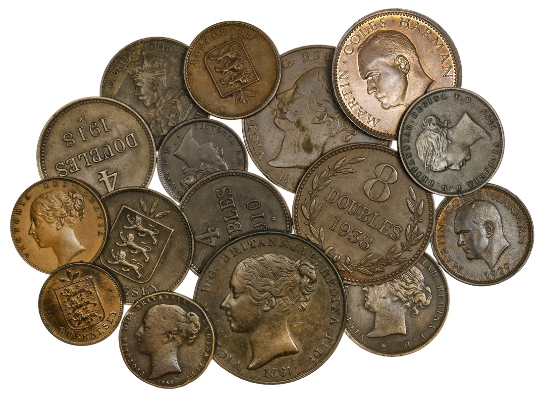Jersey, Victoria (1837-1901), One Thirteenth of a Shilling (2), 1841; 1861, plain edges, 17.26g, 12h; 17.56g, 12h (Spink 7001), very fine; and One Twenty-Sixth of a Shilling, 1866, plain edge, 4.74g, 12h (Spink 7005), very fine; and One Twenty-Fourth of a Shilling, 1888, plain edge, 5.63g, 12h (Spink 7007), very fine; and One Fifty-Second of a Shilling, 1841, plain edge, 4.26g, 12h (Spink 7003), fine; and One Forty-Eighth of a Shilling, 1877 H, plain edge, 2.85g, 12h (Spink 7008), very fine; also George V (1910-1936), One Twenty-Fourth of a Shilling, 1923, plain edge, 5.56g, 12h (Spink 7014), very fine; also Guernsey, Victoria (1837-1901), 4 Doubles, 1893 H, plain edge, 4.93g, 12h (Spink 7207), very fine; and 2 Doubles, 1858, plain edge, 4.42g, 6h (Spink 7205), stained, very fine; also Edward VII (1901-1910), 4 Doubles, 1910 H, plain edge, 4.67g, 6h (Spink 7211), very fine; and Double, 1902 H, plain edge, 2.19g, 6h (Spink 7213), lustrous, good very fine; also George V (1910-1936), 4 Doubles, 1918 H, plain edge, 4.91g, 6h (Spink 7215A), very fine; also George VI (1936-1952), 8 Doubles, 1938 H, plain edge, 9.57g, 6h (Spink 7218), good very fine; also Lundy Island, Martin Coles Harman, Puffin, 1929, bare head left, rev. puffin facing left, lettered edge, 9.94g, 12h (Spink 7850), areas of pleasing original mint red, good extremely fine; and Half Puffin, 1929, bare head left, rev. puffin facing left, lettered edge, 5.55g, 12h (Spink 7851), traces of original mint red, extremely fine; Isle of Man, Victoria (1837-1901), Farthing, 1839, young head left, rev. treskelis, plain edge, 4.76g, 4h (Spink 7419), pleasing very fine (16)