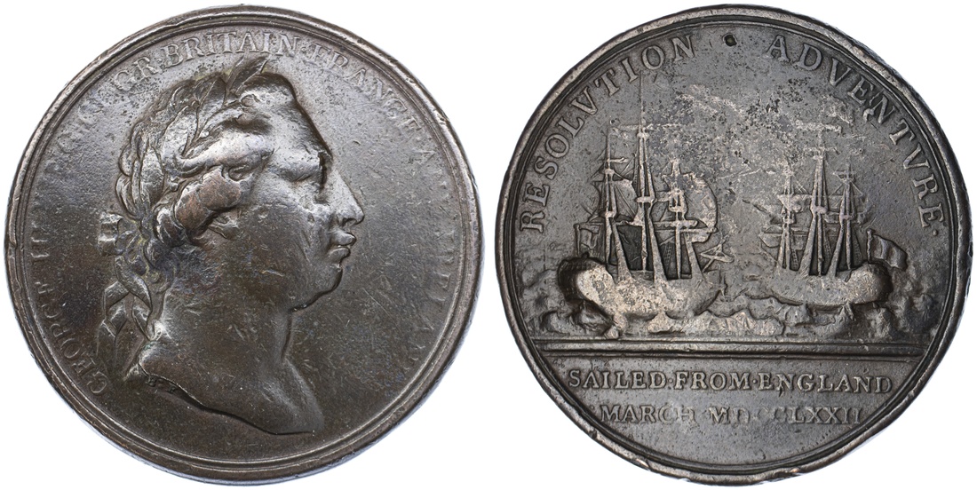 Captain Cook's Second Voyage to the Pacific Ocean, 'Resolution and Adventure' or 'Otaheite' AE Medal, 1772, [by J. Westwood Sr.], GEORGE . III . KING . OF . GR . BRITAIN . FRANCE . AND . IRELAND ETC, laureate head right of George III, rev. RESOLVTION ADVENTVRE., the two frigates, Resolution and Adventure viewed from astern, SAILED FROM ENGLAND MARCH MDCCLXXII in exergue in two lines, 44mm, 31.74g, 12h (Betts 552; BHM 165; Eimer 744b), contact marked and with a tooled mark to the reverse at 12 o'clock, smoothed and rubbed to the devices, thus fine, nonetheless an ever popular and scarcely encountered striking