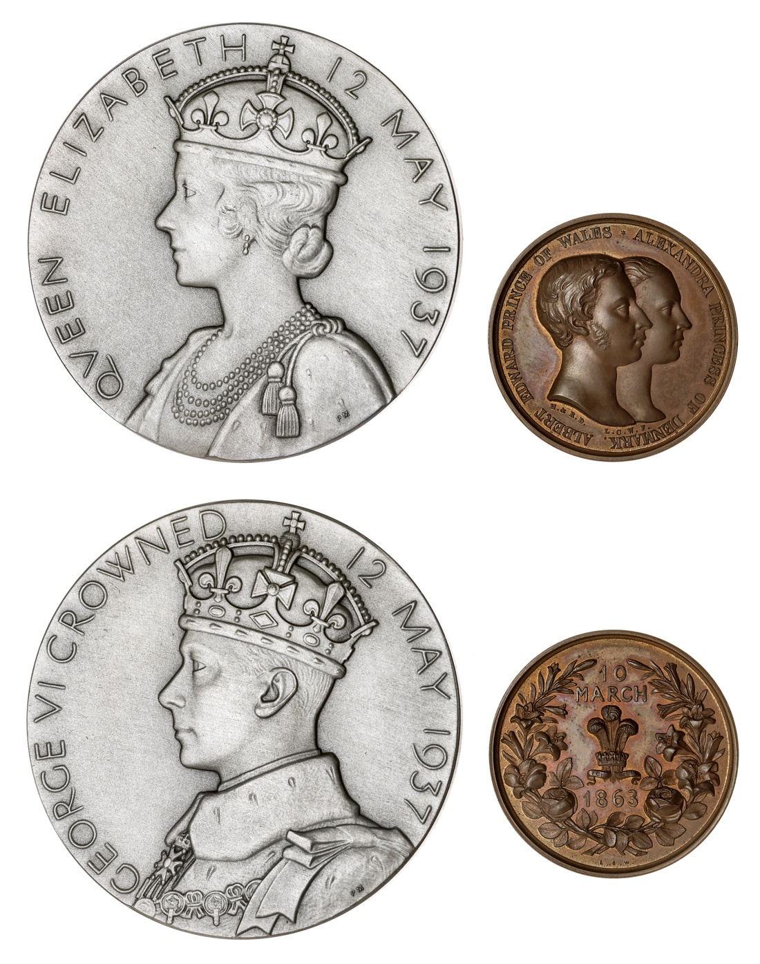 Marriage of the Prince of Wales to Princess Alexandra, AE Medal, 1863, by L.C.Wyon after Messrs Hunt and Roskell, ALBERT EDWARD PRINCE OF WALES * ALEXANDRA PRINCESS OF DENMARK, conjoined busts right, rev. 10 MARCH 1863, divided by the Plumes of the Prince of Wales, within floral border, 32mm, 12h, 19.92g (Eimer 1562), with the most handsome lustrous and richly toned fields, choice, as struck, in original case of issue; Coronation of George VI, Official AR medal, 1937, by Percy Metcalfe for the Royal Mint, GEORGE VI CROWNED 12 MAY 1937, crowned and draped bust left, rev. QUEEN ELIZABETH 12 MAY 1937, crowned and draped bust left, 82.89g, 58mm (Eimer 2046a; BHM 4314), handsome matte surfaces, as struck, in Royal Mint case of issue (2)