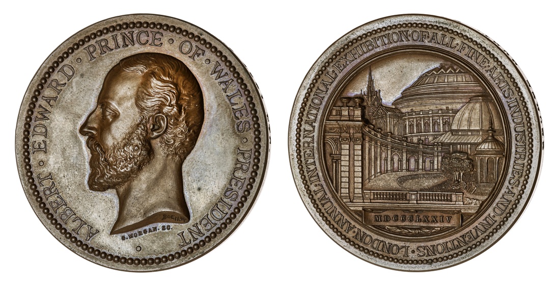 International Exhibition, London, AE Medal, 1874, J. E. Boehm and G. T. Morgan, ALBERT . EDWARD . PRINCE . OF . WALES . PRESIDENT, bare head left of Albert, Prince of Wales, rev. . LONDON . ANNUAL . INTERNATIONAL . EXHIBITION . OF . ALL . FINE . ARTS . INDUSTRIES . AND . INVENTIONS ., view of the Albert Hall, MDCCCLXXIV on banner below, GEORGE HUNT. CATALOUGE N