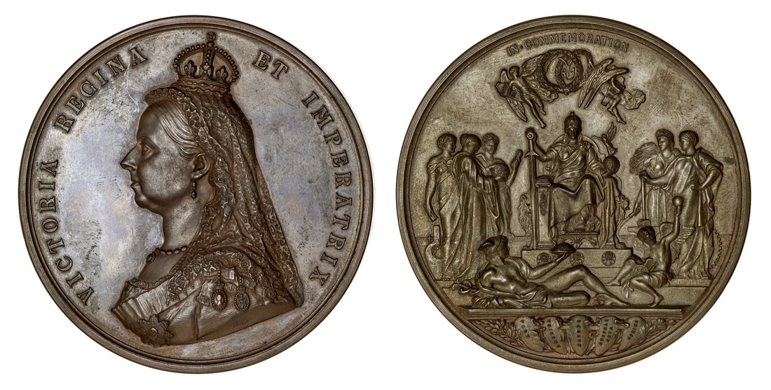 Official AE 'Golden Jubilee' Medal, 1887, by J. E. Boehm for the Royal Mint, VICTORIA REGINA ET IMPERATRIX, crowned and draped bust left, rev. IN. COMMEMORATION, enthroned figure of Empire, flanked by figures of Science, Letters and Art, Industry and Agriculture, shields below inscribed ASIA AMERICA EUROPE AUSTRALASIA and AFRICA, 77mm, 201.67g (Eimer 1733b; BHM 3219; Wollaston 39), small areas of verdigris to the obverse, otherwise with pleasing brown surfaces, lighter to the obverse and with a residual lustre beneath, near as struck, in original case of issue