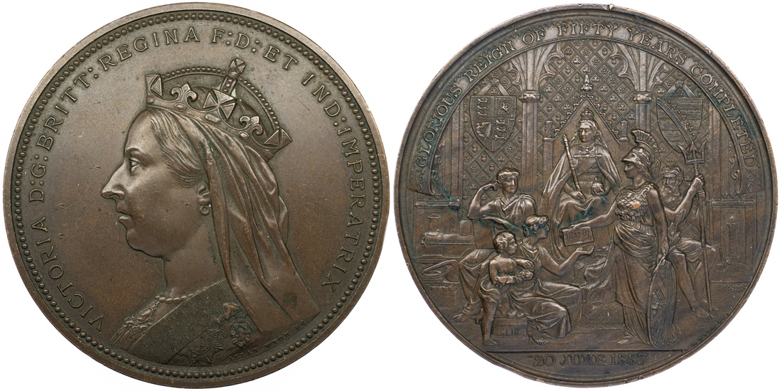 Golden Jubilee of Queen Victoria, AE Medal, 1887, by A. Wyon, VICTORIA A : G : BRITT : REGINA F : D ET IND : IMPERATRIX, crowned veiled and draped bust left, rev. GLORIOUS REIGN OF FIFTY YEARS COMPLETED, Victoria enthroned, facing, flanked by Industry and Neptune, behind, shields of Britain and Saxe-Coburg-Gotha, Britannia displays scroll inscribed 1837-87, 30 JUNE 1887 in exergue, 64mm, 156.85g (Eimer 1734; BHM 3290), a scattering of small bagmarks and surface marking, an unfortunate belt of verdigris to reverse but otherwise a pleasing example of a rare issue with lovely classical imagery, good very fine