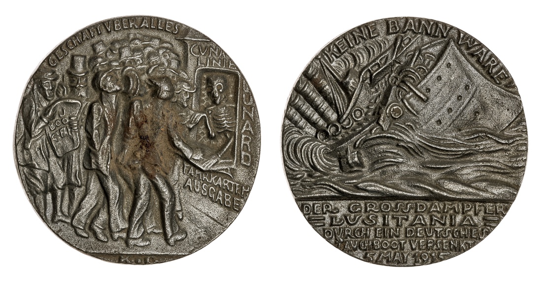 Sinking of the Lusitania, WM Cast Medal, early to mid 20th century, after Karl Goetz produced by the Lusitania Souvenir Medal Committee, , KEINE BANNI WARE, the ship sinking, dated May 1915 in exergue, rev. death selling tickets at the box office, 55mm, g (Kienast 156), rusted patch to the reverse, otherwise as struck, in original case of issue and with original pamphlet, scarcely encountered