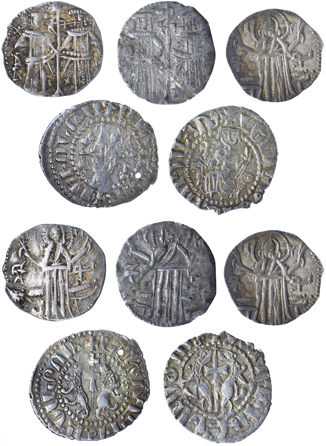 Various World Coins including (5) | Kingdom of Armenia, Leo I the Great (1198-1219), Trams (2), silver, king seated on throne ornamented with lions, his feet resting on a footstool, wearing a crown and royal mantle on his shoulders, holding a cross in his right hand and fleur-de-lis in his left hand, rev. long cross with two bars, between two lions regardant, 2.94g, 1h; 2.62g, 6h (Nercessian 282), one fuller but pierced at 10 o'clock, pleasing toning to both; also Second Bulgaria Empire, Ivan Alexander (1331-1371), Groshes (3), silver, Tsar and his son Michael facing with sceptre upright, in between staff at the foot end on both sides star, rev. Christ with nimbus facing standing before throne, both hands raised, in benediction, 1.36g, 6h; 1.47g, 6h; 1.48g, 7h (Yeoman and Friedberg 74), all boldly struck with relatively complete flans, toned, very fine (5)