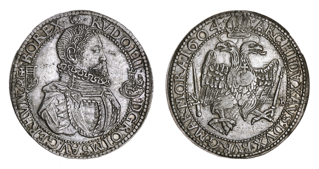 Austria, Rudolf II (1576-1612), Thaler, 1604, Nagybánya, armoured and draped bust right, rev. double-headed Imperial eagle, dividing N-B, 12h, 27.71g (Huszár 1041; Voglhuber 102; Davenport 3015), small metal flaw before the eye and some softness to the highest points of the devices, wiped nevertheless now retoning and with a pearlescent tone to the fields, good very fine and ever popular