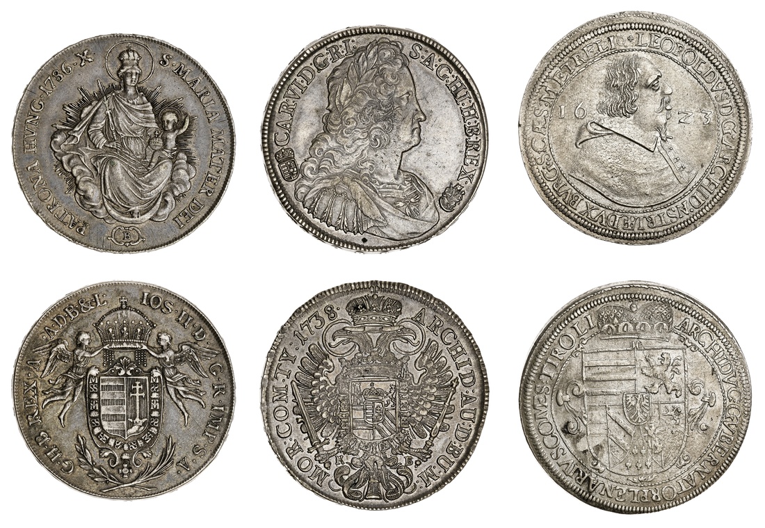 Austria, Archduke Leopold, as Bishop of Strassburg (1619-1632), Thaler, 1623, Hall, draped bust right dividing date, rev. crowned and lightly garnished shield, plain edge, 12h, 28.71g (Dav. 3330; Vog. 175/II), bright, struck on a slightly convex flan and with evidence of metal stressing to the bust, nevertheless nearing extremely fine; Joseph II (1765-1790), Thaler, 1786, Kremnitz, crowned shield with supporters, rev. Madonna and Child seated, security edge, 12h, 28.03g (Dav 1169; Vog.295/II), a touch of softness to the highest points and some flan adjustment marks to reverse field, otherwise pleasingly toned in the fields, good very fine; Karl VI (1711-1740), Thaler, 1738, Kremnitz, laureate and cuirassed bust right, rev. crowned double headed eagle dividing K-B, upwards lettered edge, 12h, 28.73g (Dav 1062; Vog.260/IV), some contact marking and slightly weakly struck in centre of obverse, yet lustrous in fields, good very fine / extremely fine (3)