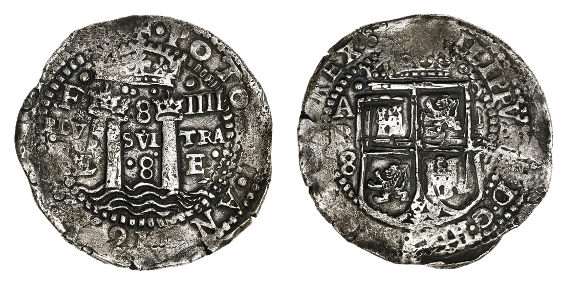 (x) Bolivia, Philip IV (1621-1665), Transitional Type IV/A, Cob 8-Reales, 16[52] E, Potosi, E • 8 • E •, crowned pillars with waves, rev. crowned shield, dividing A-P-8 and O-E-52, 27.49g, 10h (KM A20.4), water worn and flat in parts, blundering to the reverse, nevertheless on a mostly full flan, good very fine for this type