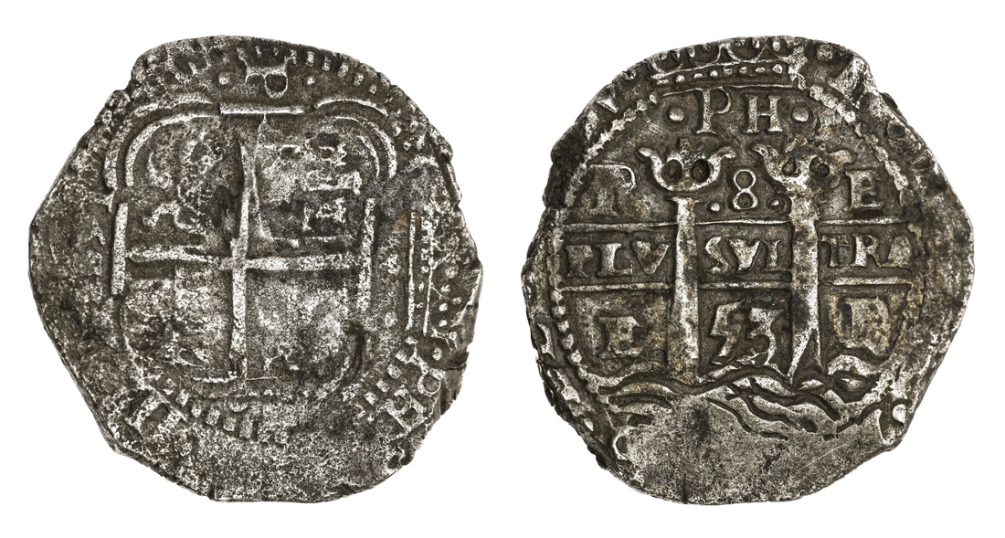 (x) Bolivia, Philip IV (1621-1665), Cob 8-Reales, 1653 E, Potosi, • PH •, crowned pillars with waves, rev. cross potent, pomegranate between dots, 22.57g, 3h (KM 21), water worn and porous, flat in parts and on an uneven flan, nevertheless the obverse detials pleasing, very fine / fine