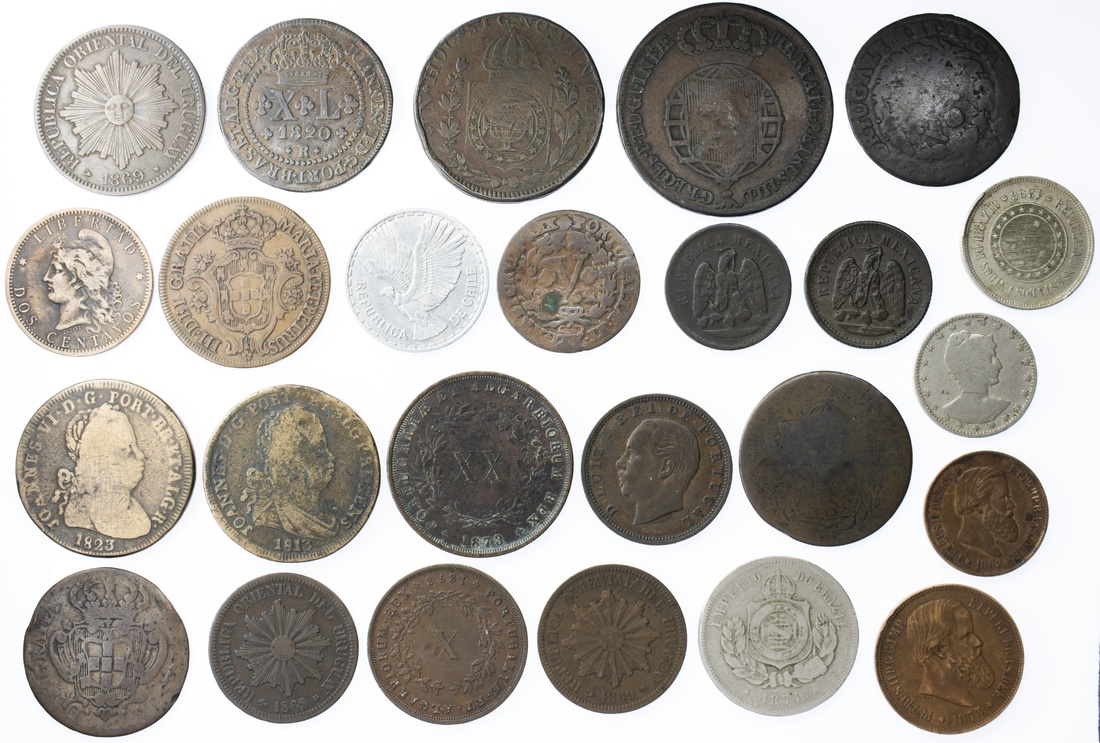 South America and World (25) | Brazil, João VI (1816-1822), 40 Reis, 1820, plain edge, 14.10g, 12h (KM 319), very fine; also Pedro II (1831-1889, 200 Reis, 1874, plain edge, 14.61g, 6h (KM 478), fine; and 20 Reis, 1873, plain edge, 11.99g, 6h (KM 479), cleaned, about very fine; and 20 Reis, 1869, plain edge, 6.86g, 6h (KM 474), very fine; and Republic, 100 Reis, 1889, plain edge, 10.01g, 6h (KM 492), about very fine; and 'Liberty' 200 Reis, 1901, plain edge, 7.99g, 6h (KM 504), fine; also Brazil for Portugal, Countermarked 40 Reis, struck on 80 Reis, 1830, plain edge, 28.29g, 6h (KM 444), countermark fair, hoist coin fair; and Countermarked 20 Reis, struck on 40 Reis, date illegible, 12.86g (KM 436), hoist coin fair, countermark fine; also Portugal, João V (1706-1750), 10 Reis, 1743, 9.85g, 12h (KM 227; Gomes J5 35), fair; another, date illegible, 11.42g, 12h (KM 227?), scratched and flat, fair; also Jose I (1750-1777), 5 Reis, 1764, 5.39g, 12h (KM 242), fine; also Maria I and Pedro III (1777-1786), 10 Reis, 1785, plain edge, 12.59g, 12h (KM 18/262; Gomes 04), light brown fields, about very fine; also João VI as Prince Regent (1799-1816), 40 Reis, 1813, Lisbon, laureate and draped bust right, rev. crowned shield, plain edge, 37.95g, 12h (KM 345.1), bagmarked, good fine; another, as King (1816-1826), 1823, plain edge, 37.44g, 12h (KM 345.1), scratched and mostly flat, fine; also Luís I (1861-1889), 20 Reis, 1873, plain edge, 26.61g, 6h (KM 515; Gomes L1 06), good fine; and 20 Reis, 1883, plain edge, 12.10g, 6h (KM 527; Gomes L1 07), lightly contact marked, about very fine; 10 Reis, 1873, plain edge, 12.61g, 6h (KM 514; Gomes L1 04), fine; also Portuguese Angola, Maria I and Pedro III (1777-1786), Countermarked 2 Macutas, c. 1837, under reign of Maria II (1834-1853), struck on Macuta, 1786, plain edge, 36.75g, 12h (KM 51.2), hoist coin flat in parts, about very fine, the countermark very fine; also Uruguay, Republic, 4 Centesimos, 1869 H, Heaton, plain edge, 19.72g, 6h (KM 13), some bagmarks, very fine; 2 Centesimos, 1869 H, Heaton, plain edge, 9.52g, 6h (KM 12), about very fine; and 2 Centesimos, 1869 A, Paris, plain edge, 10.01g, 6h (KM 12), about very fine; also Argentina, Republic, 2 Centavos, 1884, plain edge, 9.62g, 6h (KM 33), rubbed about very fine; also Chile, Republic, Centesimo, 1961, plain edge, 3.02g, 6h (KM 189), bagmarks to reverse, very fine; also Mexico, Republic, Centavo, 1891 Mo (2), plain edges, 7.76g, 6h; 8.02g (KM 391), very fine and fine (25)