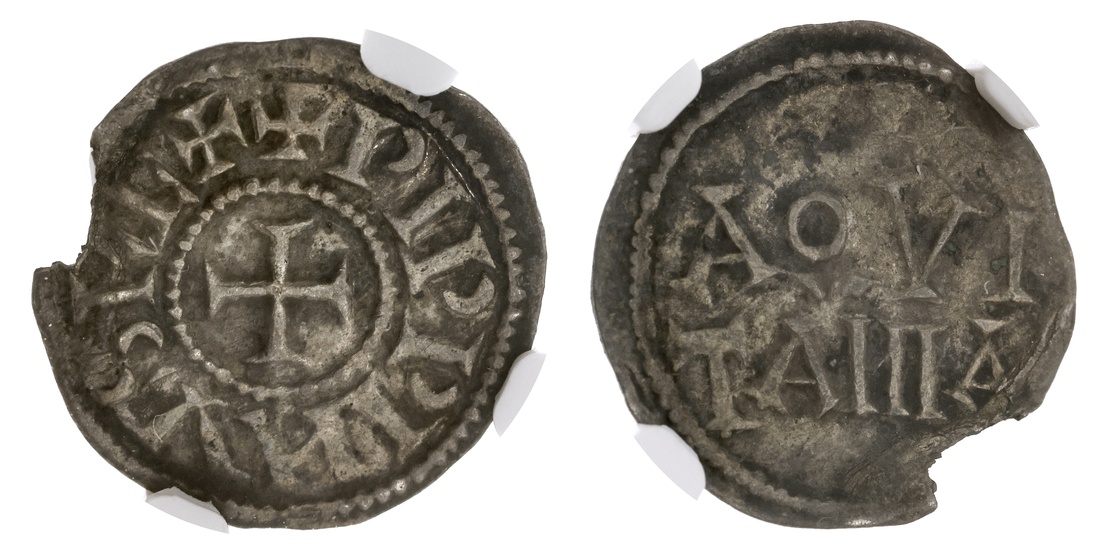 France, Carolingian, Pepin II (839-858), Obol, Aquitaine, + PIPPIN VSRE +, short cross, rev. AQVI | TANIA, 10h (Depeyrot 1868; MEC 813; MG 601), small chip to the edge, otherwise a clear and bold strike, dark tone, very fine, in NGC holder, graded CHIPPED (Cert. #6356325-004)