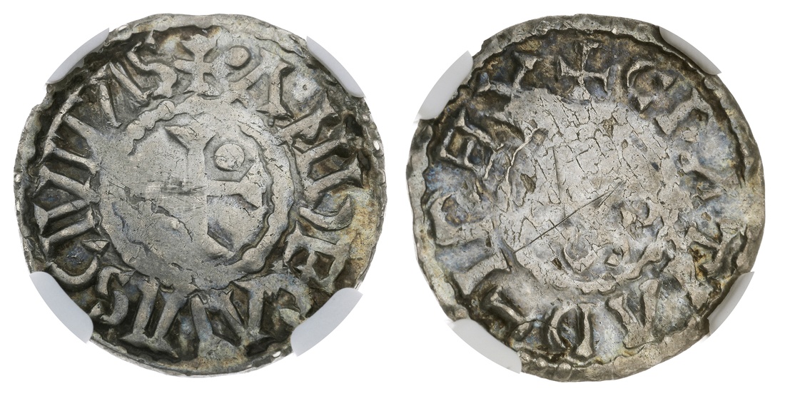 France, Carolingian, Charles the Simple (898-923), Denier, Angers, + GRATIA D-I REX, monogram within inner circle, rev. + . ANDECAVIS CIVITAS, plain cross, pellet in first angle, 3h (Morrison 1408; Nouchy 6), scratched and soft in parts, otherwise with a rich glossy cabinet tone, about very fine, in NGC holder, graded VF DETAILS, SCRATCHES (Cert. #6356324-001)