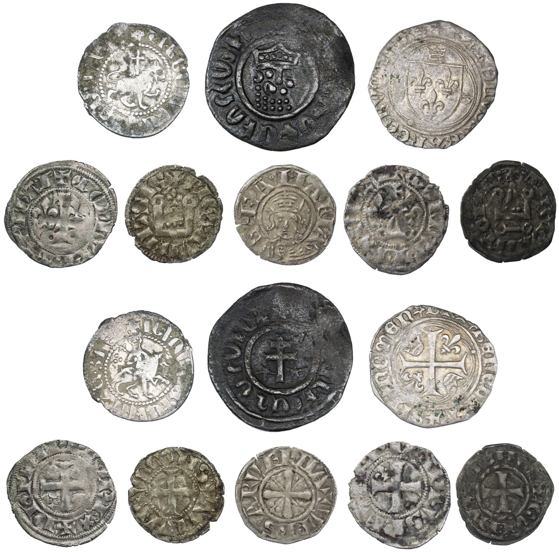 Medieval France and Armenia (8) | Kingdom of France, Louis IX (1226-1270) BI Denier Tournois, cross Pattee, rev. chatel Tournois, 0.77g, (Lafourie, 201; Ciani, 184) fine; Philip IV, Double-Tournois (2), cross with lys in one angle, rev. turret between two lys, 0.90g; 1.09g, (Ciani, 218; Lafourie, 201) both about fine; Charles VIII, (1483-1497) Blanc a la Couronne, KAROLVS FRANCORVM REX, coat-of-arms between three crowns within trilobe rev. SIT NOMEN DNI BENEDICTVM, cross pattée within quatrelobe; alternating crowns and lys in spandrels, 2.85g, (Duplessy, 587) good fine to very fine; County of Poitou, Alphonse de France (1241-1271), BI Denier, cross, rev. castle surmounted by lys, 0.83g, (Boud, 431) about fine; Bishopric of Clermont, Anonymous Issue, Denier, bust of Virgin Mary facing, rev. cross, trefoils in angles, 0.91g, (Boud, 381) about very fine; Kingdom of Armenia, Levon I (1199-1219), Tank, crowned Leonine portrait three quarters right, rev. double cross between stars, 7.73g (Bed. pl. XV) flattened to edge of flan but otherwise good fine; Levon III, (1301-1307) Takvorin, king on horseback right, rev. lion with cross behind, 2.34g, (Bed. pl. XXXIX) worn edges with deposits but otherwise residually lustrous, good fine to very fine (8)