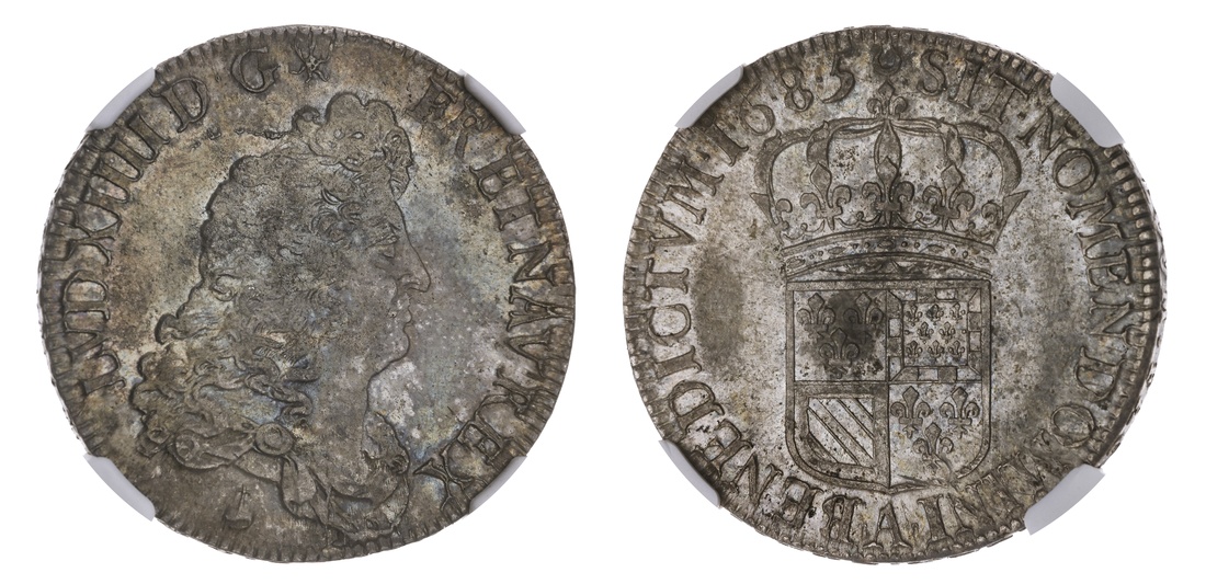 *TOP POP* NGC MS62 | France, Louis XIV 'The Sun King' (1610-1643), Demi-Écu of Flanders, 1685 A, Paris, draped bust right, rev. crowned shield, upwards lettered edge, 6h (KM 262.1; Dy royales 1510; Ciani 1885), small metal flaw behind the hair and a touch of rub to the highest points, nevertheless with a dark cabinet tone and lustrous in the fields, most pleasing extremely fine, in NGC holder, graded MS62 (Cert. #6266183-006)
