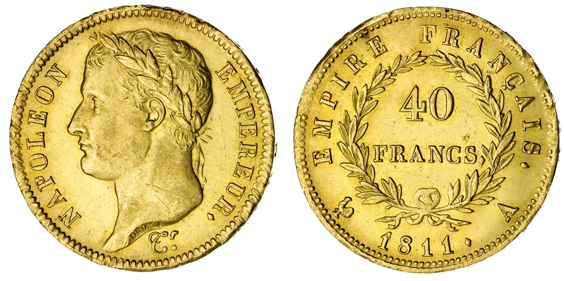 (g) France, First Empire, Napoleon Bonaparte (1804-1815), Gold 40-Francs, 1811 A, Paris, NAPOLEON EMPEREUR, laureate head left, rev. EMPIRE FRANCAIS, 40 FRANCS in wreath, Cockerel 1811 A below, DIEU PROTEGE LA FRANCE incuse upwards on edge, 12.91g [199.6grns], 5h (Friedberg 505; Gad. 1084; KM 696.1; Le Franc 541), some rim nicks above head and superficial bagmarks, otherwise beautifully lustrous, much as issued, rare in this exemplary state