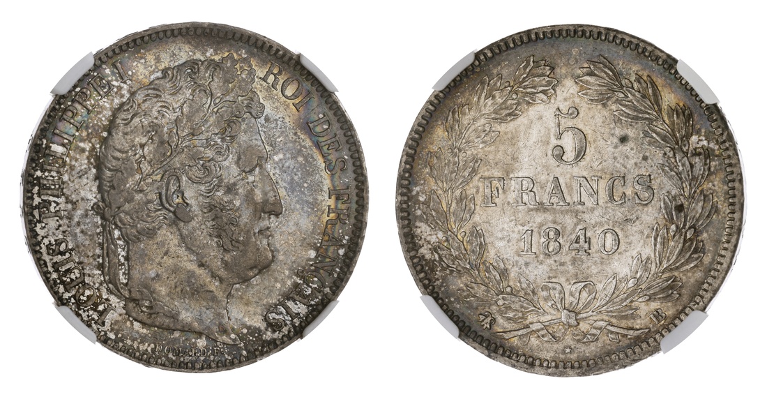 NGC AU55 | France, Kingdom, Louis Philippe I (1830-1848), silver 5-Francs, 1840 BB, Strasbourg, laureate bust right, rev. 5 | FRANCS | 1840 in wreath, downwards lettered edge, 6h (KM 749.2), lightly bagmarked and rub to the highest points of the hair, yet with dark speckled toning, very fine, in NGC holder, graded AU55 (Cert. #3233708-003) (2)