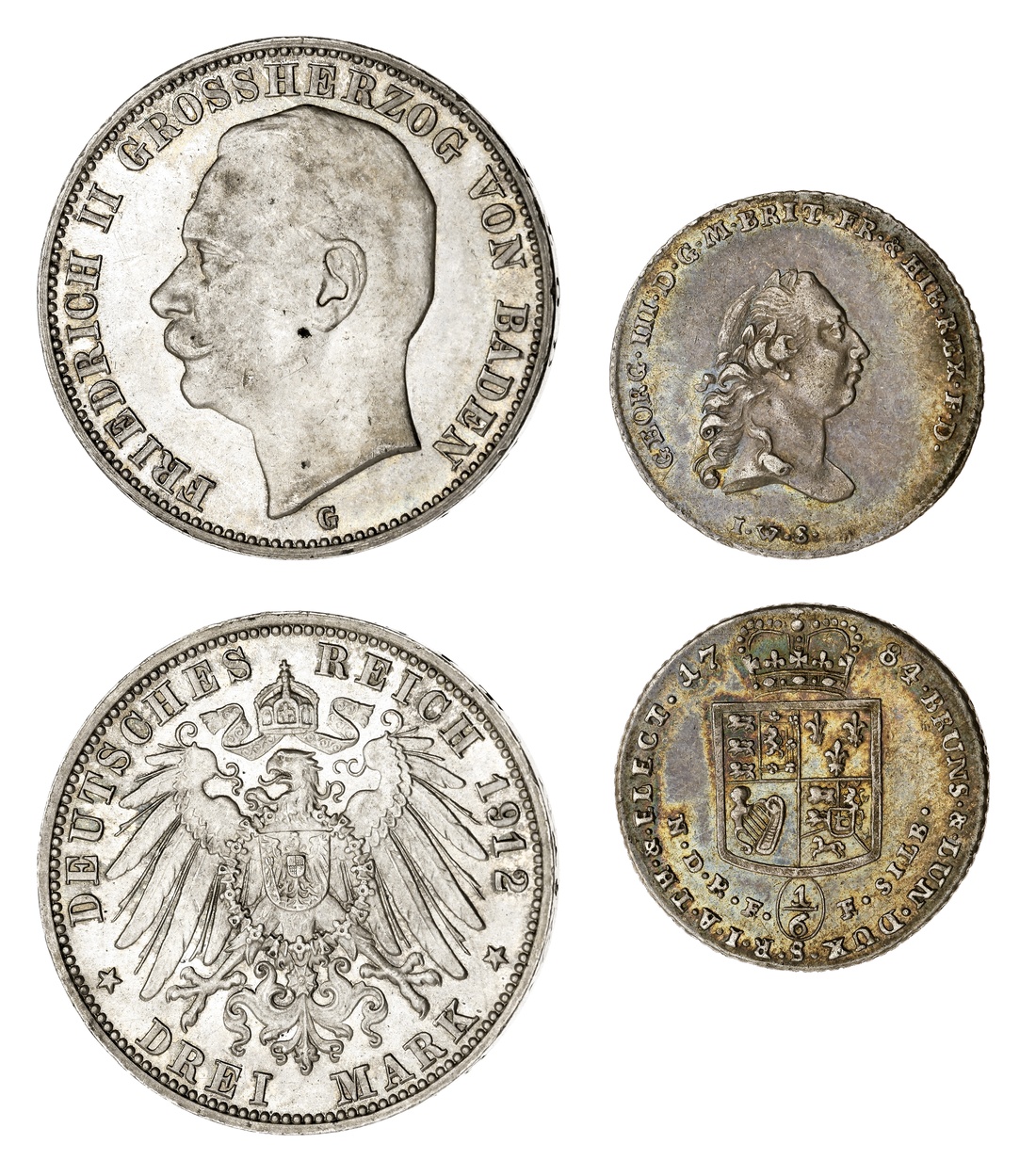 Anglo-Hanoverian Issues, Brunswick-Calenburg-Hannover, George III (1760-1820) 1/6-Taler, 1784, IWS, laureate bust right, rev. crowned shield, obliquely milled edge, 3.17g, 6h (Welter 2834), rub to the hair, yet with a tone and lustre in the fields, very fine; Germany, Baden, Friedrich II (1907-1918), 3-Mark, 1912, Karlsruhe, bare head left, rev. crowned eagle, incuse upwards lettered edge, 16.68g, 12h (KM 280), scratched to the obverse field, otherwise with a handsome cartwheel lustre to the fields, extremely fine (2)