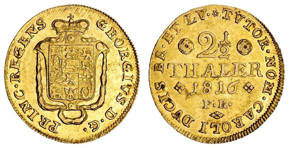 (g) Germany, Brunswick-Wolfenbüttel, Karl II, under the Prince Regent of Great Britain (1815-1823), Anglo-Hanoverian Issues, Gold 2½-Thaler, 1816-FR, Brunswick, under Friedrich Ritter, GEORGIVS D. G. PRINC REGENS, garlanded Arms, titles of the Prince Regent, rev. * TVTOR • NOM • CAROLI • DUCIS • BR • ET • LV • * 2½ * THALER * 1816 * in three lines flanked by flowers, F.R. below, edge obliquely milled, 3.31g [51.0grns], 12h (Divo-Schramm 53; Fb. 734; Jaeger 307a; KM 1072; Schlum. 184; Welter 2954), light handling marks in otherwise residually brilliant fields, good very fine, very rare, and the earliest coinage struck under the Protectorship of the Prince Regent and future King George IV