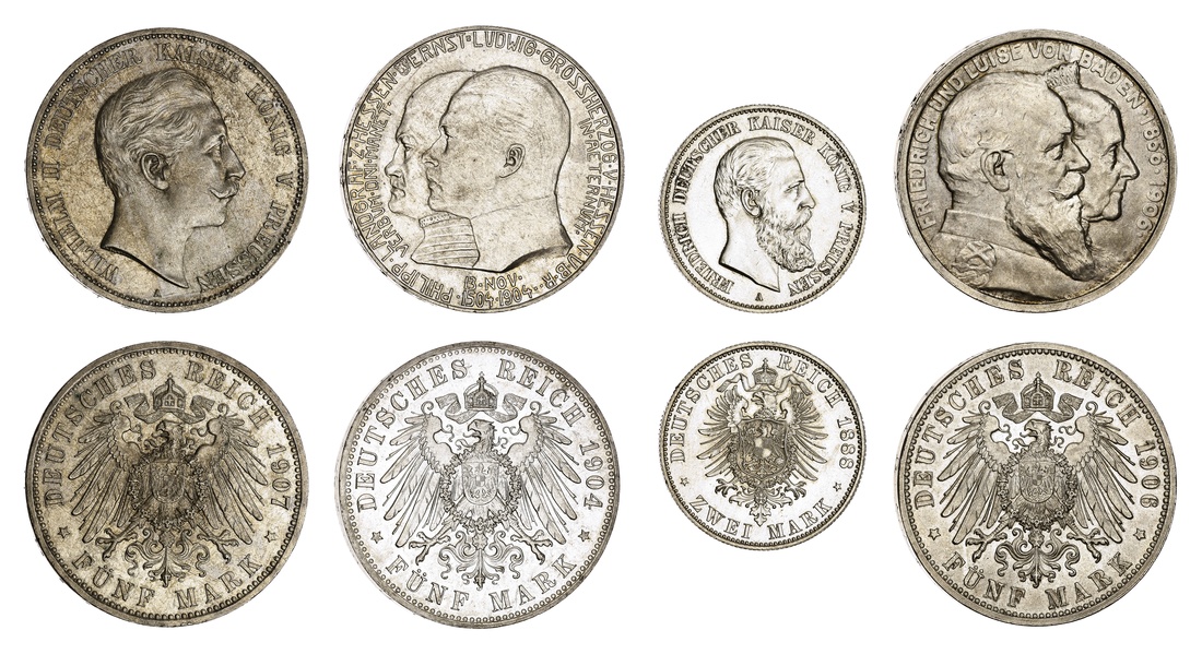 German States, Prussia, Friedrich III (1888), 2 Mark, 1888 A, Berlin, bare head right, rev. crowned eagle, milled edge, 12h, 11.11g (Jaeger 98; KM 510), some friction marking to the obverse, yet with a full mint bloom, uncirculated; Prussia, Wilhelm II (1888-1918), 5 Mark, 1906 A, Berlin, bare head right, rev. crowned eagle, incuse lettered edge, 12h, 27.70g (Jaeger 104; KM 523), some faint contact marks to the obverse, otherwise with a handsome cartwheel lustre and speckled toning, extremely fine; Baden, Friedrich I (1852-1907), 'Golden Wedding Anniversary' 5 Mark, 1906, conjoined and draped busts right of Friedrich I and Princess Louise, rev. crowned eagle, incuse lettered edge, 12h, 27.83g (Jaeger 35; KM 277), with a handsome mint lustre, uncirculated; Hesse, Ernst Ludwig (1892-1918), '400th Anniversary of the Birth of Philip I', 5 Mark, 1904, conjoined busts left, rev. crowned eagle, incuse lettered edge, 12h, 27.80g (Jaeger 75; KM 373), some hairlines to the fields, nevertheless mostly lustrous, more so to the reverse, extremely fine (4)