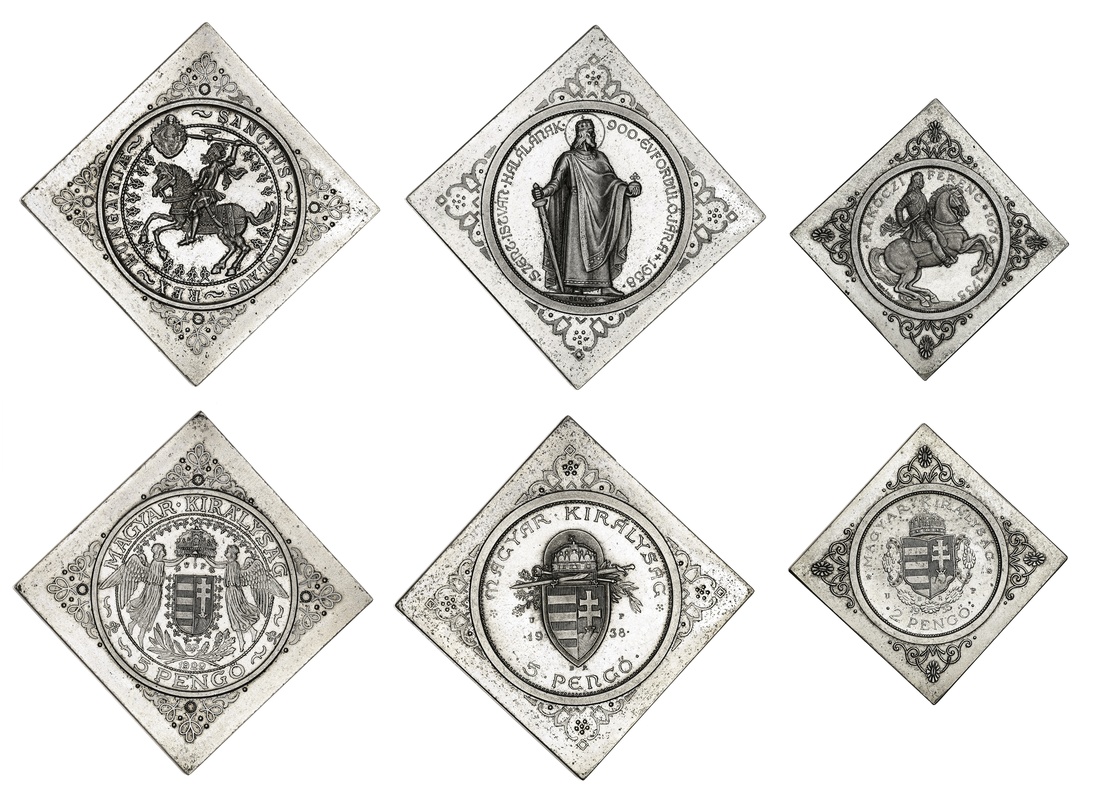 Hungary, Proof Artex Restrike 5-Pengo Klippe of 1929 BP, struck c. 1963-1965, St. Ladislaus on horseback riding left, with raised spear, radiant Madonna and Child above, rev. crowned arms, with angel supporters, plain edge, 12h, 50.15g, some hairlining, nevertheless with a glossy brilliance to the fields, handsome extremely fine; '900th Anniversary of Death of St. Stephan' Proof Artex Restrike 5-Pengo Klippe of 1938, struck c. 1963-1965, St Stephan standing facing right, holding orb and sword, rev. crowned shield, plain edge, 50.16g, 12h, light hairlining to the fields and with speckles of dark toning, otherwise with a glossy brilliance to the fields, handsome extremely fine; '200th Anniversary of the Death of Francis II' Proof Artex Restrike 2-Pengo Klippe of 1925, struck c. 1963-1965, Francis II on horseback riding right, rev. crowned and garnished shield, plain edge, 20.23g, 12hspeckled dark toning, with a slight haziness to otherwise glossy and brilliant fields, extremely fine (3)