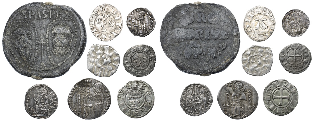 Coins and Seals of the Medieval Italian States (8) |Ancona, Republic, Bolognino, c.13th Century, DE ANCON, large A in centre, rev. A CVS, 0.89g, (CNI 8/68var.) slight rub but otherwise residually lustrous, good very fine; Denaro, V C S in field, rev. cross, 0.62g, (CNI, 1/2-3) darkly toned, about very fine; Venice, Pietro Gradenigo (1289-1311), Grosso, Doge and Saint Mark standing facing, each holding banner between them rev. Christ enthroned facing, pellet in lower left side of throne, 2.05g, (Paolucci, 2) residually lustrous, some deposits on reverse but otherwise good fine to very fine; Andrea Dandolo, (1342-1354) Mezzanino, Christ standing facing, rev. Doge and Saint Mark standing facing, 0.69g, (Paolucci, 3) residually lustrous, a scratch to lower right but otherwise about very fine; Andrea Contarini, (1368-1382), Soldino, Doge standing left holding banner, rev. lion, 0.53g, (CNI IV, 2), slightly flattened and scratch but residually lustrous and about very fine; Lucca, Henry III, IV or V (1039-1125), Denaro, + IMPERATOR TH, rev. + EHRIRVS, 0.85g, (CNI 70/3ff.) bright but worn, good to fine; Duchy of Milan, Gian Galezzo and Bernabo Visconti (1354-1378), Sesino, serpent, rev. cross, 1.08g, (CNI 1, 44), light toning, about very fine; The Papal States, Pope Gregory X, (1271-1276) Lead Seal or Bulla, S PA S PE, nimbate facing heads of St. Paul, bald and with a long, linear beard, on the left and St. Peter, with curly hair and beard composed of pellets, on the right; between them, Latin cross on a long staff and base; all within a circular, dotted border rev. GRE GORIVS oPPo Xo in three lines, the whole within a circular dotted border, 45.28g, (Serafini, 1-2) light oxidisation, however well centred and good fine (8)