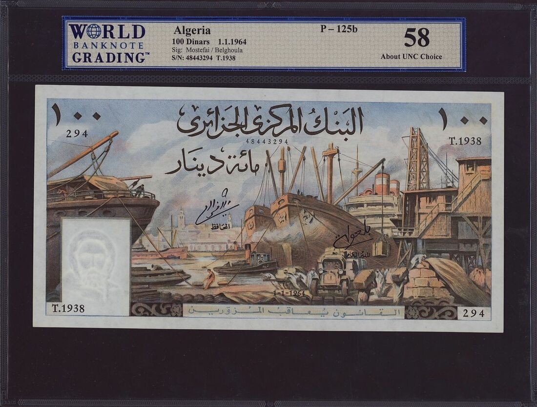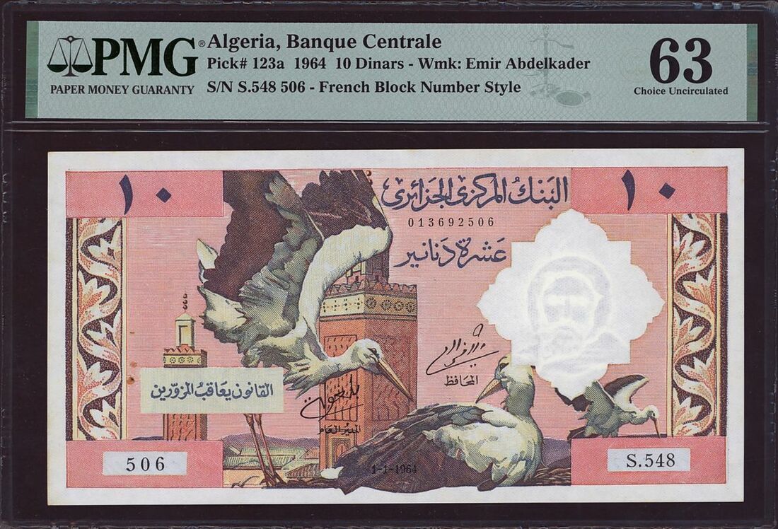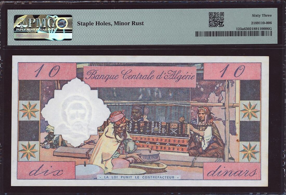 (x) Banque Centrale d'Algerie [2 notes] 10, 100 Dinars, 1964, (Pick 123a, 125b, BNB 302, 304), in PMG holder 63 Choice Uncirculated and WBG holder 58 About Uncirculated Choice, two staple holes and minor rust on 10 dinars note (2 notes)