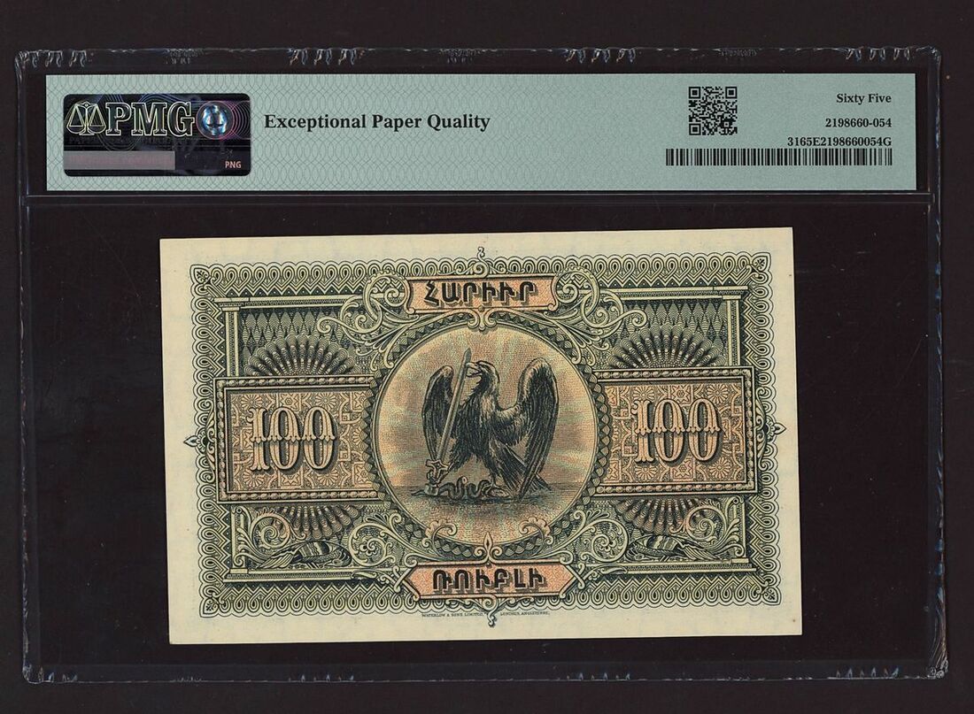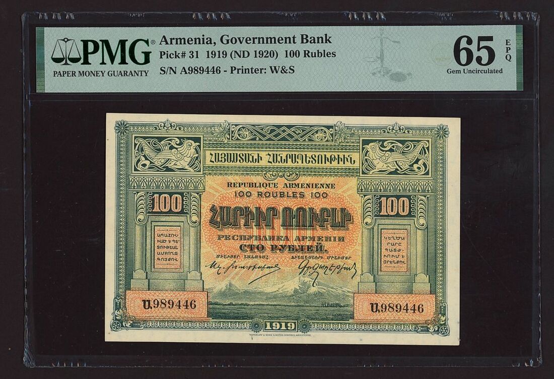 (x) Armenia, Government Bank, 100 Roubles, 1919 (ND 1920), serial number A989446, (Pick 31, BNB 102), in PMG holder 65 EPQ Gem Uncirculated