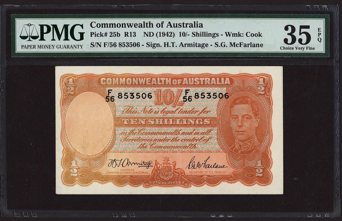 (x) Commonwealth of Australia, 10 Shillings, ND (1942), serial number F/56 853506, (Pick 25b, BNB 131), in PMG holder 35 EPQ Choice Very Fine