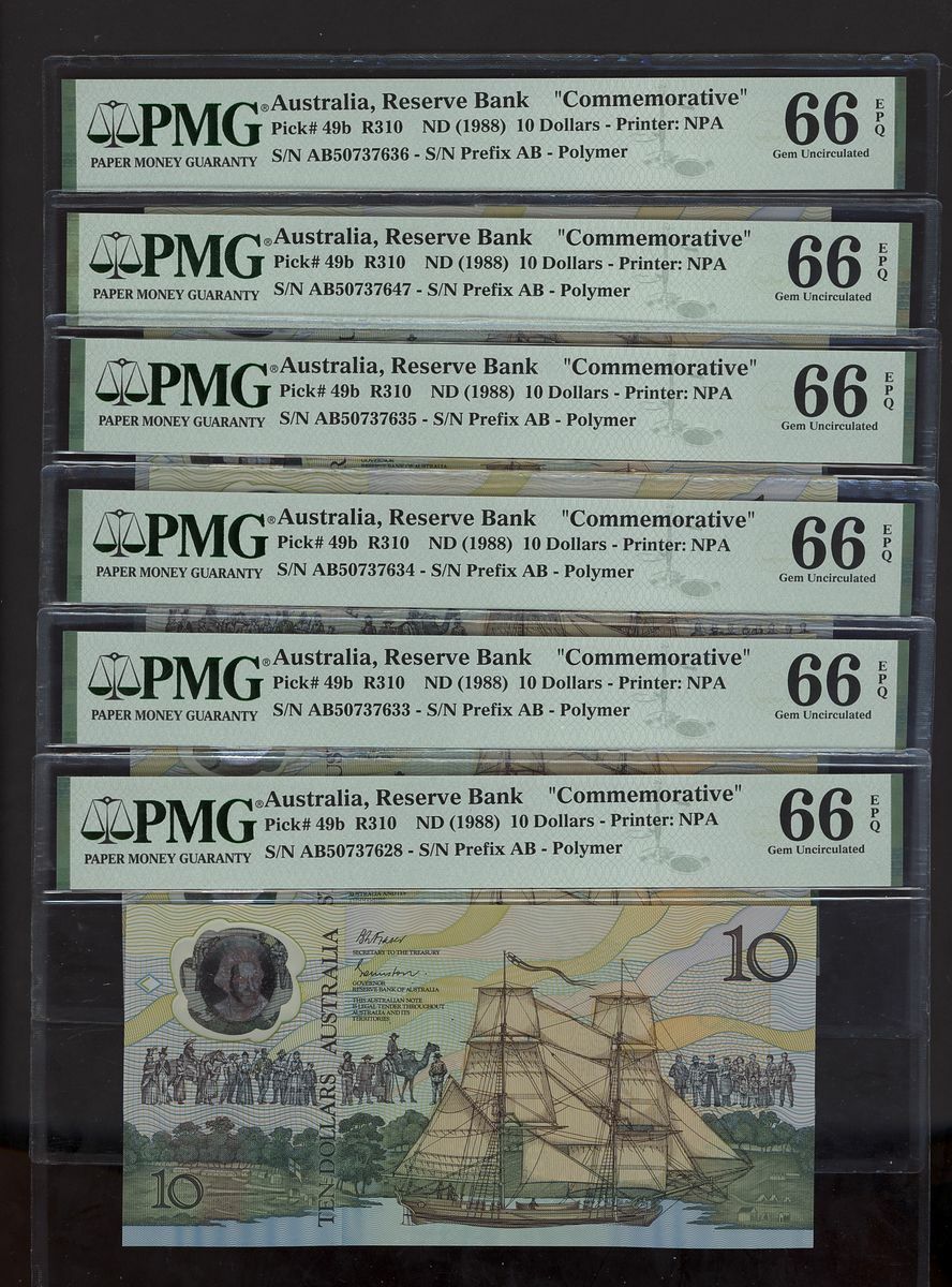 (x) Australia, Reserve Bank, [6 notes] $10, commemorative, ND (1988), including a group of 4 consecutive serial numbers AB50737633-6