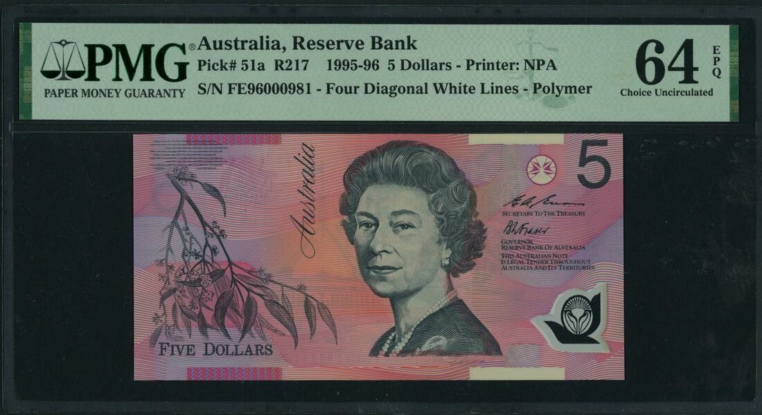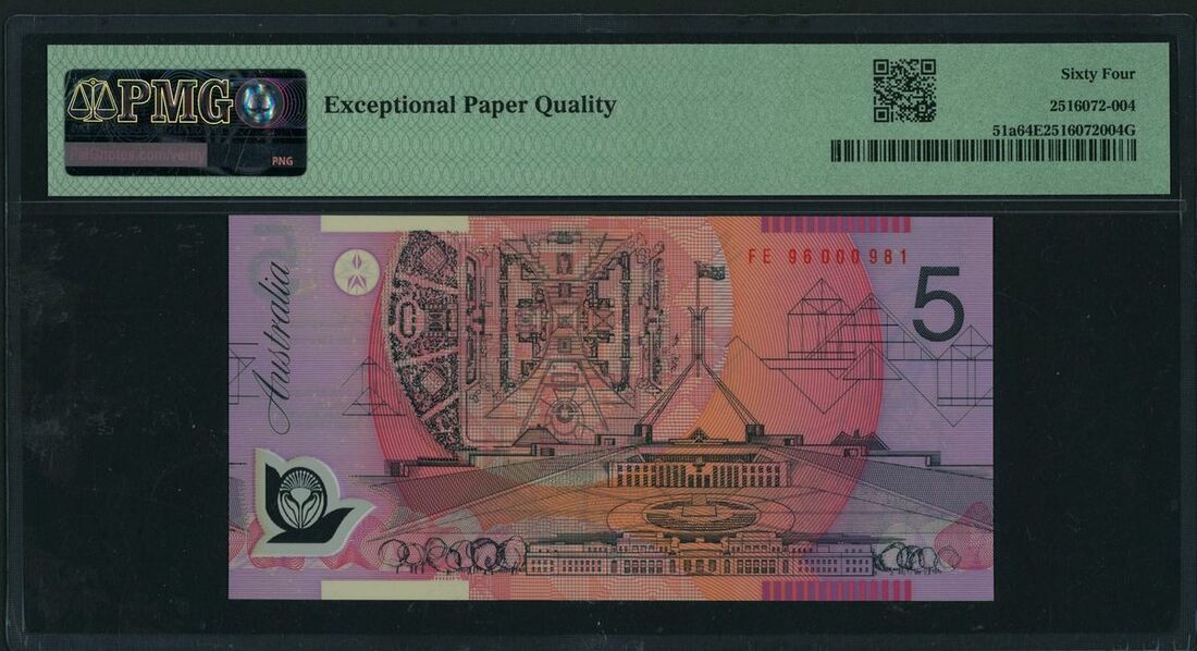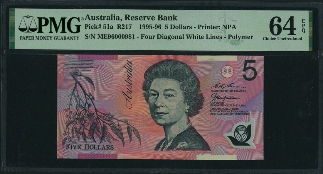 (x) Australia, Reserve Bank, [2 notes] $5, 1995-1996, serial number ME96000981, (Pick 51c, BNB 219d), in PMG holders 64 EPQ Choice Uncirculated and 64 EPQ Choice Uncirculated (2 notes)