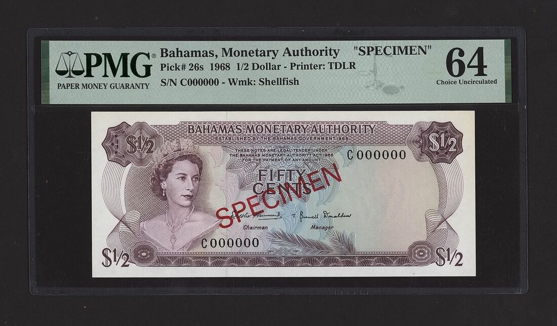 (x) Bahamas, Monetary Authority, specimen 1/2 Dollar, 1968, serial number C000000, (Pick 26s, BNB 201), in PMG holder 64 Choice Uncirculated