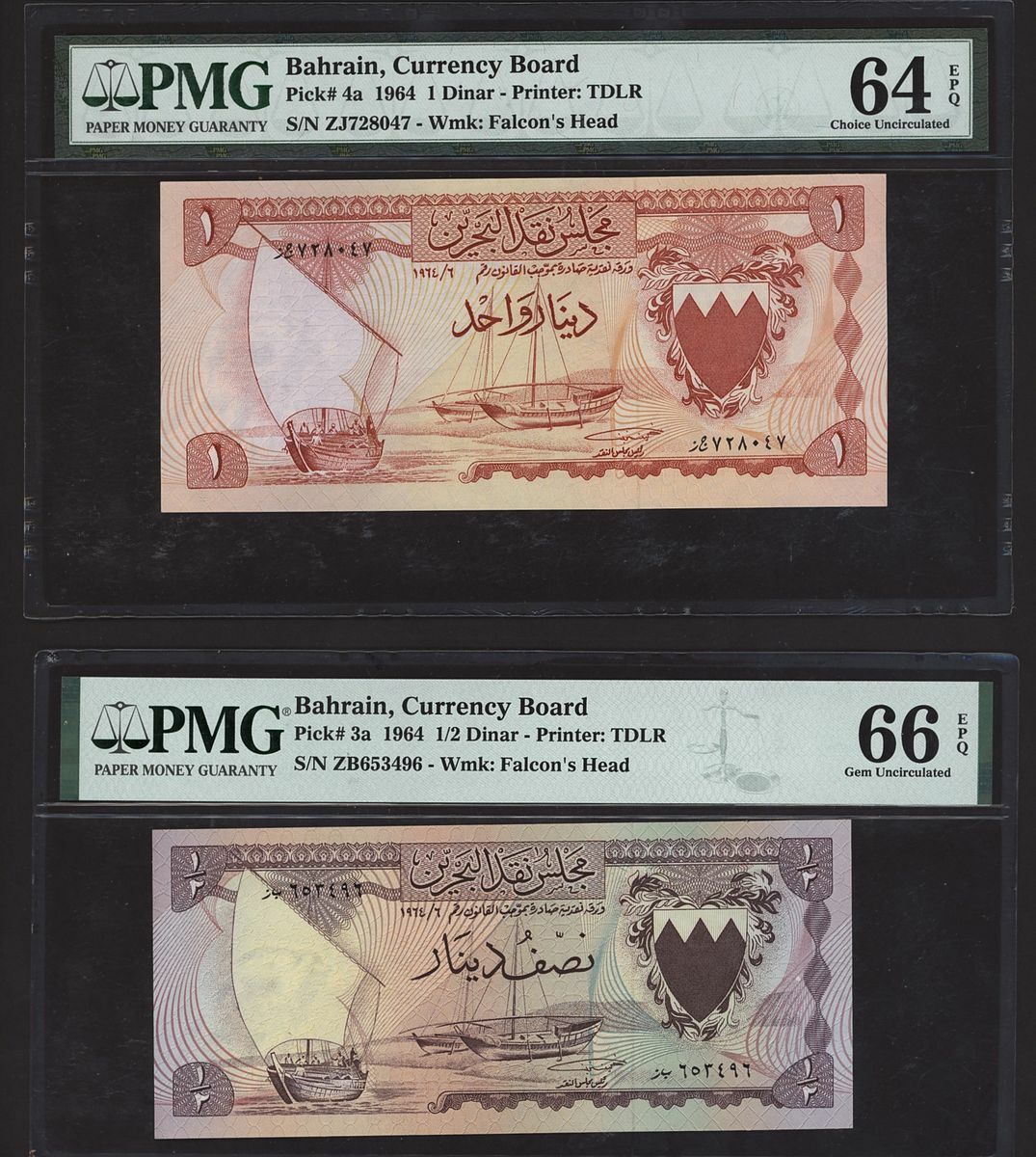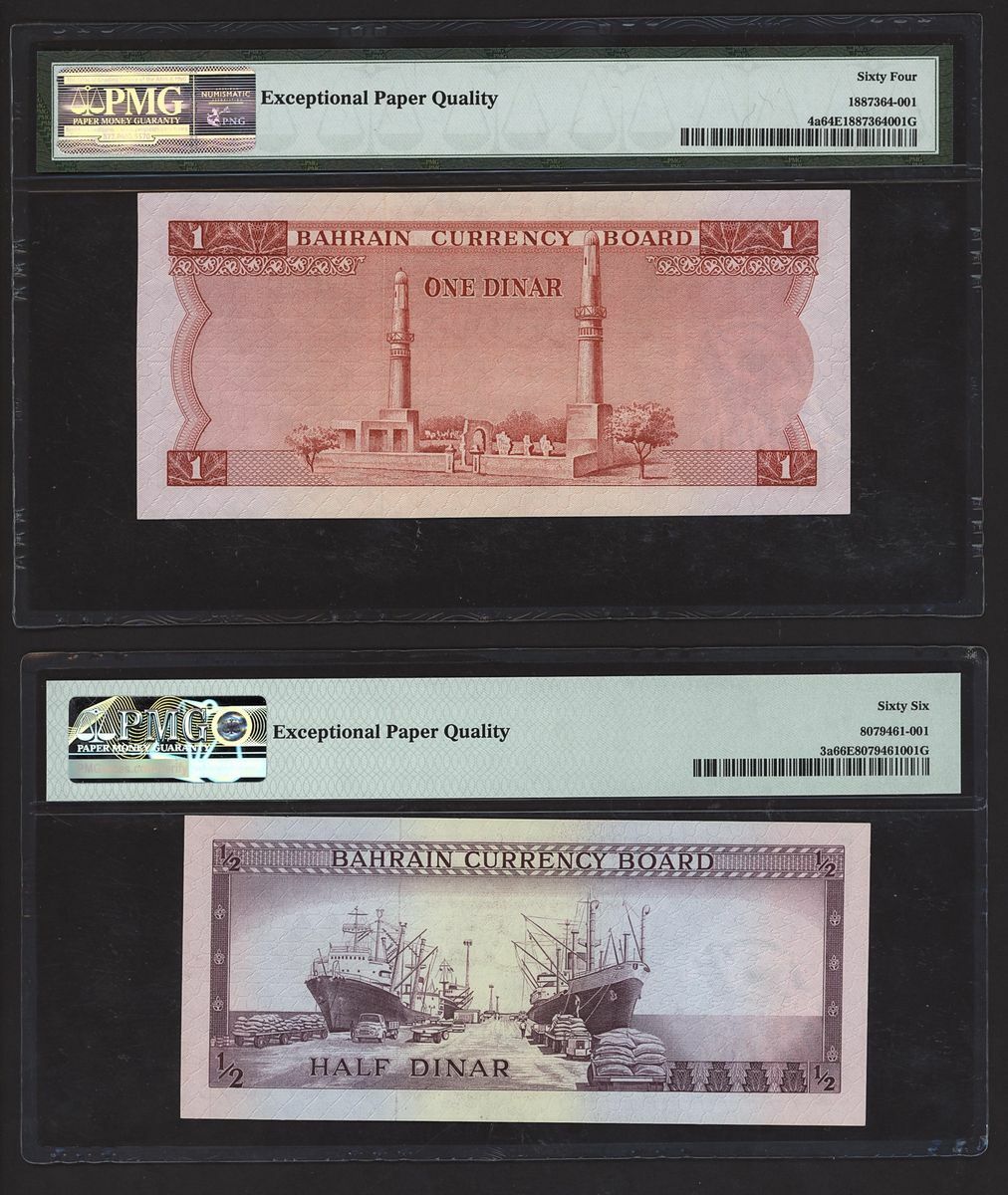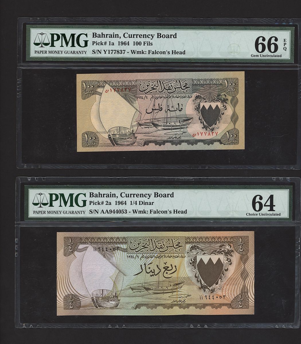(x) Bahrain, Currency Board, [4 notes] 100 Fils, 1/4, 1/2, 1 Dinar, 1964, (Pick 1a, 2a, 3a, 4a, BNB 101a, 102a, 103a, 104a), in PMG holders 64 Choice Uncirculated (2) and 66 EPQ Gem Uncirculated (2) (4 notes)