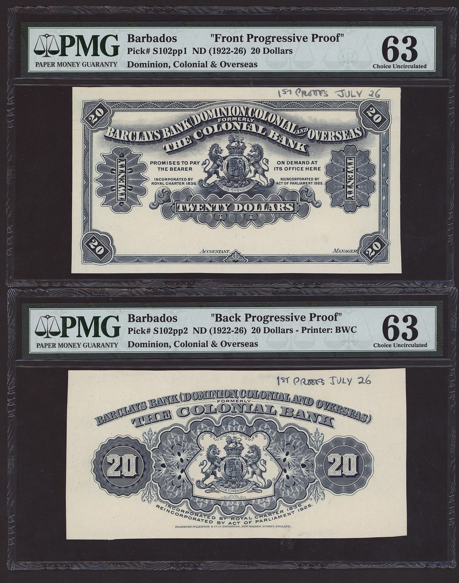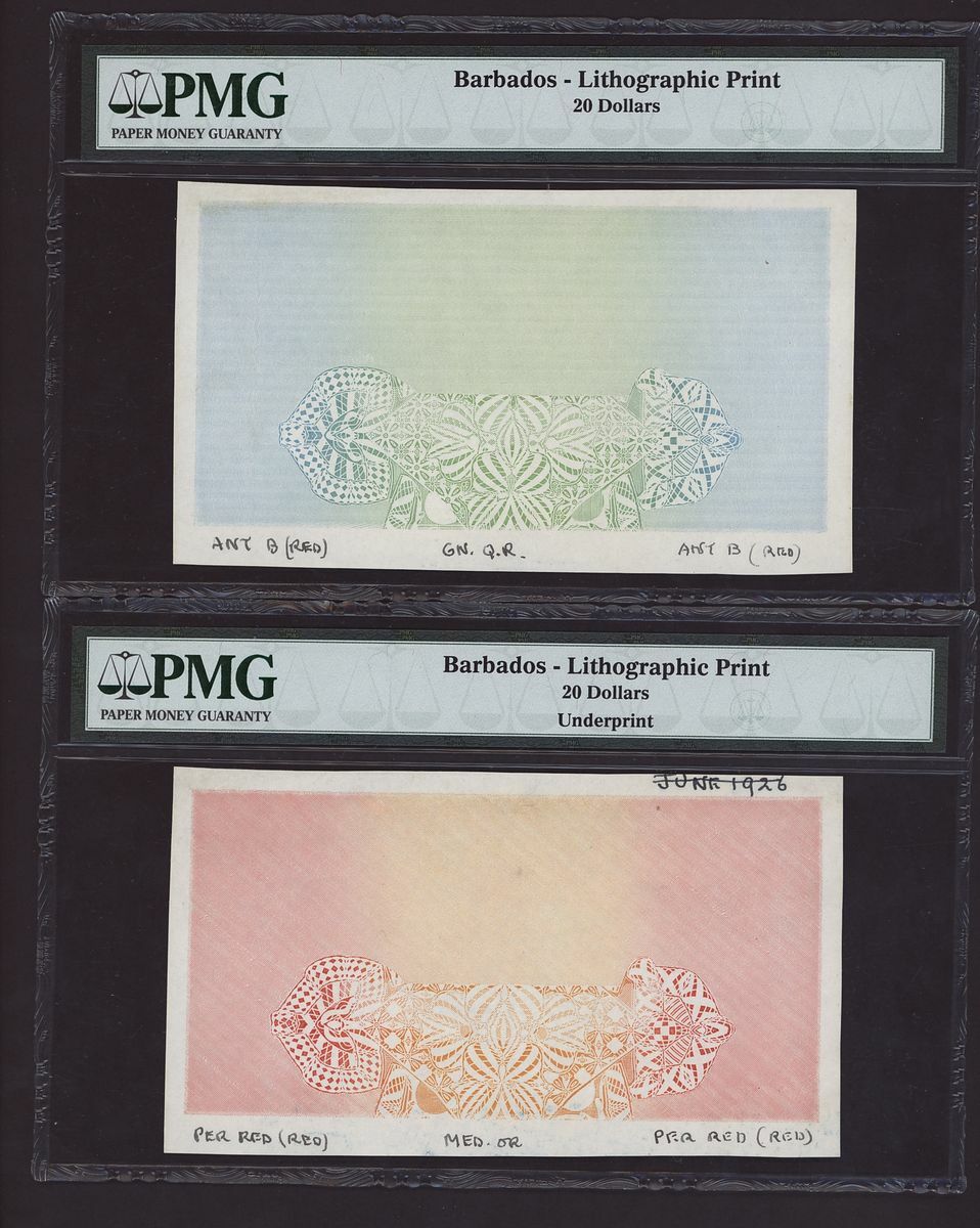 (x) Colonial Bank, Barbados, Group of (4) front and back progressive proofs and Lithographic prints for 20 Dollars, Dominion Colonial and Overseas,