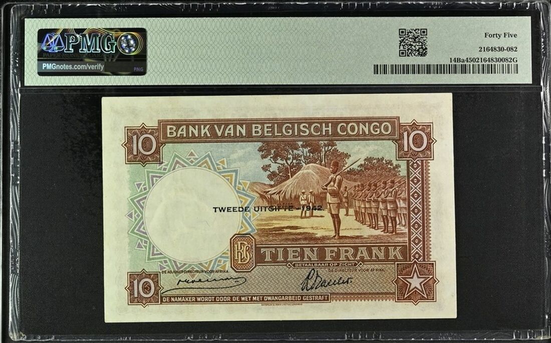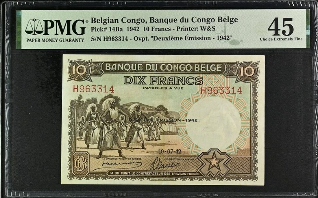 Banque du Congo Belge, 10 Francs, 10th July 1942, serial number H963314, (Pick 14Ba, BNB 212a), in PMG holder 45 Choice Extremely Fine, only 7 notes in higher grade